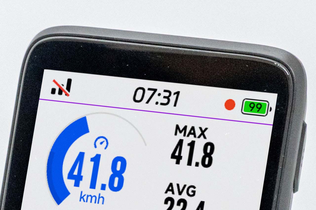 特に自分が最も頻繁に使うマップ+走行情報の画面では、iGS800の最上部は地図だけの表示。残りの6セグメントは速度、斜度、パワー、ケイデンス、心拍、ギアに割り当てているのでサイコンでは現在時刻が確認できません。