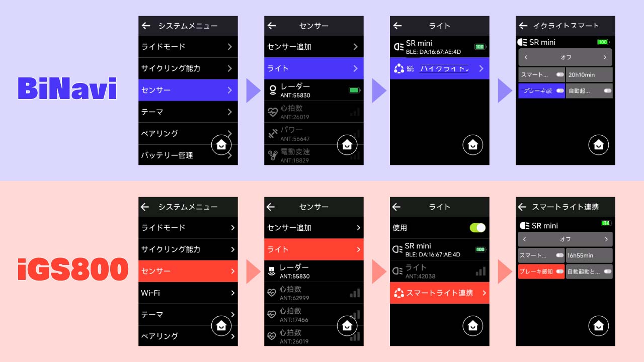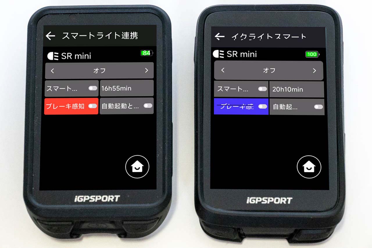設定画面は システムメニュー → センサー → ライト → スマートライト連携(iGS800)/バイクライトスマート接続(BiNavi)に進むと表示され、「ブレーキ感知」をタップすればオンオフの切り替えが可能。これでSR mini稼働中のバッテリー不安が、ちょっとだけ減ります。
