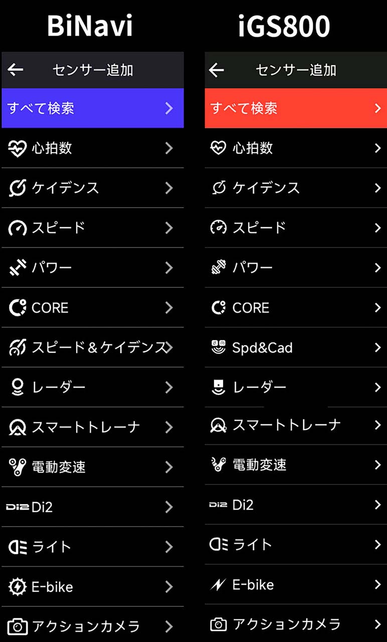 こちらも当初はiGS800は非対応で、BiNaviしか対応していなかった項目(のはず)。最新のファームでは「センサー」のメニュー項目を見てみると、iGS800の方にも「CORE」という項目があります。これが、深部体温センサーのことですよね。