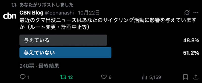 先日「最近のクマ出没に関するニュースはあなたのサイクリング活動に影響を与えていますか(ルート変更・計画中止等)」というアンケートをXで実施しました。ご参加いただいた皆様、誠にありがとうございます。