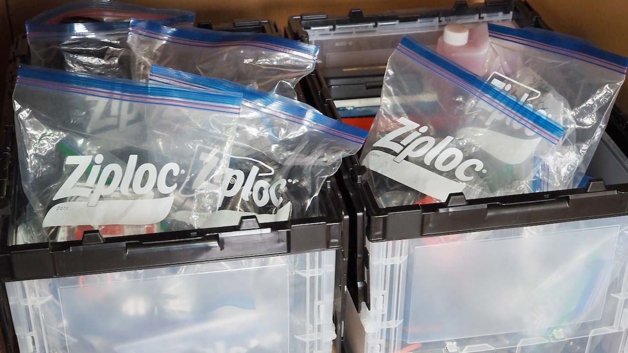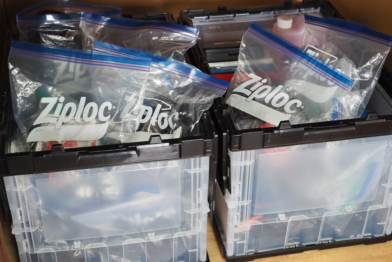 バッグ内の様々なものを整理整頓する目的でジップロックのバッグを使うのにドはまりしました。なのでフレームバッグやシートバッグの中には、小さいものが整理されて入れられているジップロックのバッグを入れています。パーツ用のバッグ、パーソナルアイテムのバッグ、エレクトロニクスと充電器のバッグ、等々。私はこのシステムを自宅でも採用しており、いろんなものが入ったジップロックバッグ用の保管箱が複数あります。例えば自転車用のパーツなど。