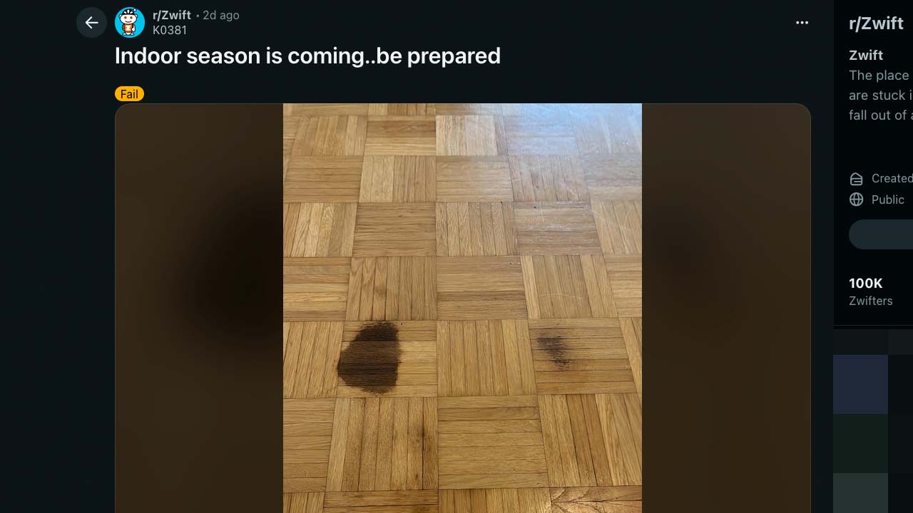 いつも同じ場所にスマートトレーナーを設置したまま運用していたという方が、海外掲示板のZwiftコミュニティで注意喚起されていたのでご紹介します。