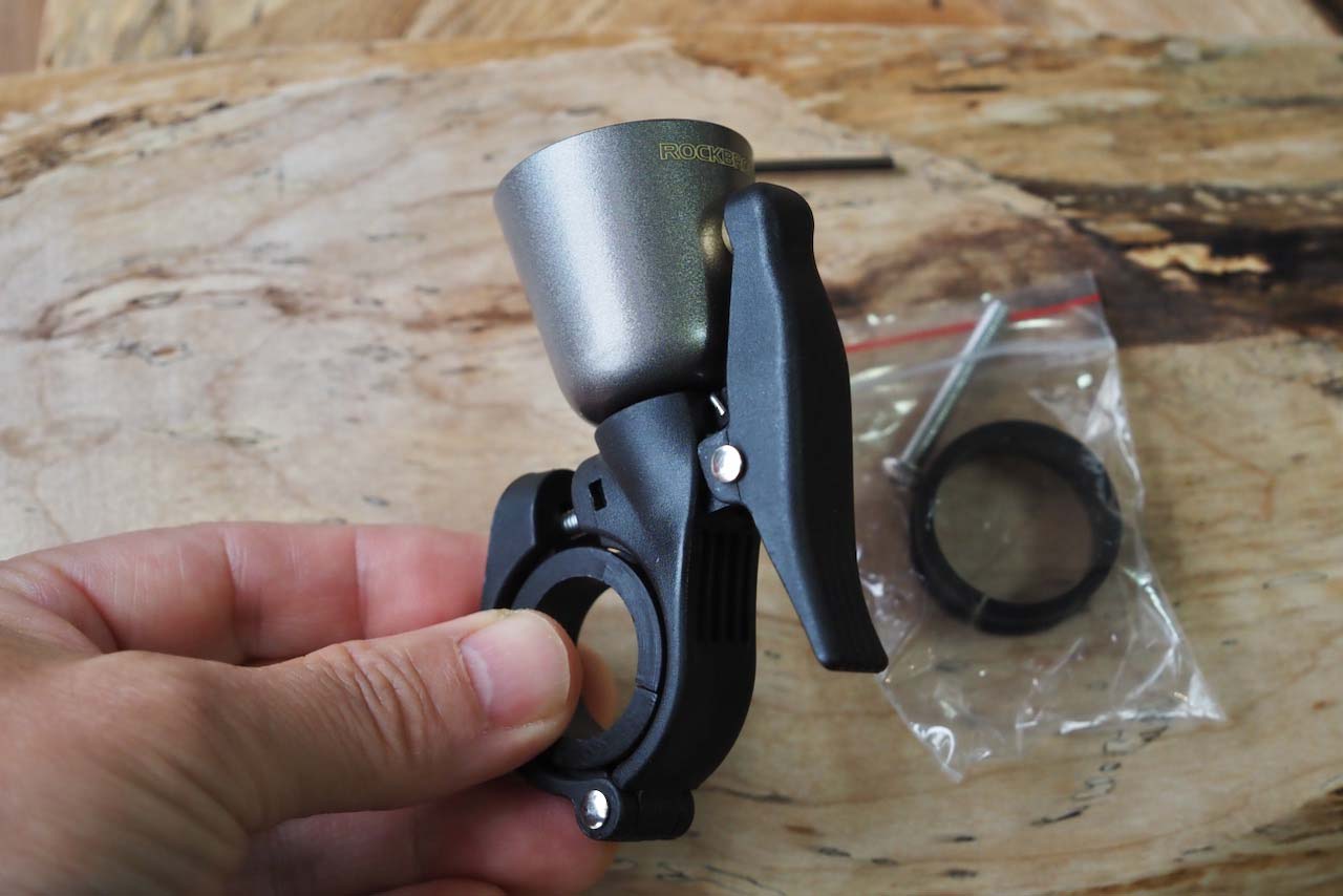 スペーサー類、付属品込みの写真です。22-31.8mmまでのハンドルに対応。筆者はミニベロ・Dahon K3(関連記事一覧)の細いハンドルで使います。