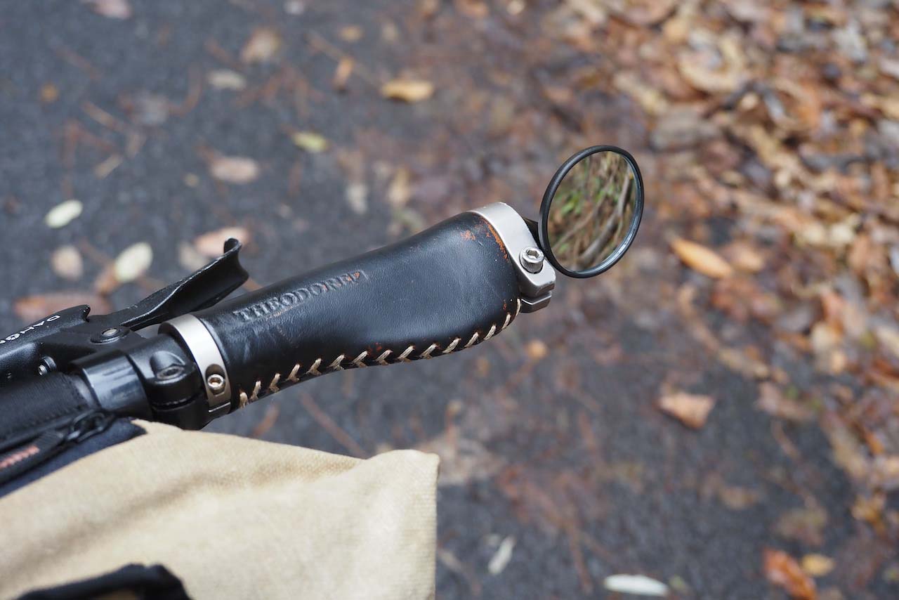 フラットバーハンドルに差し込んだ様子です。ROCKBROSのミラー(レビュー記事)をグラベル用バイクで使っていてなかなか便利なので、ミニベロにもミラーを導入しようと考えたのでした。ならベストセラーのBM-45を試さないわけにはいかない、と思ったのです。