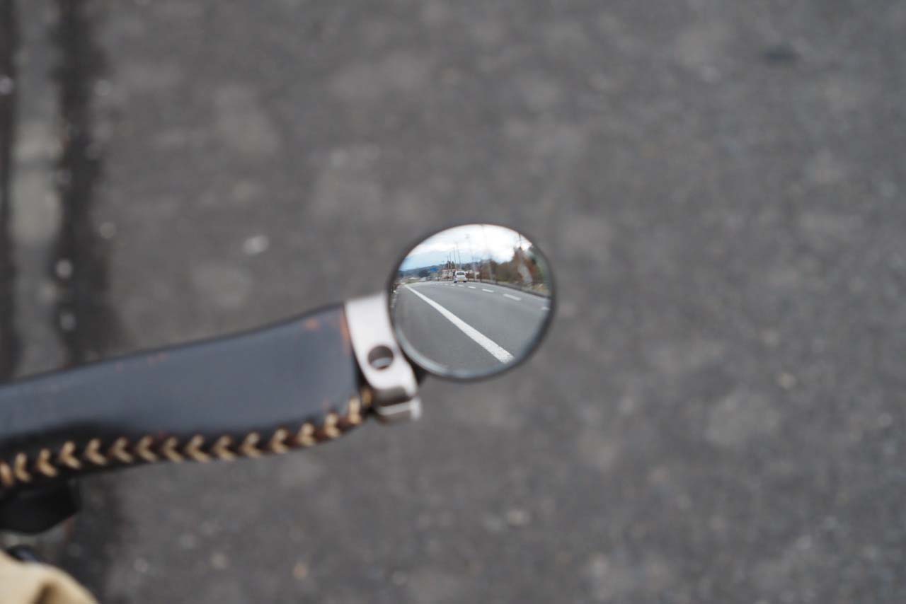 文字を読むわけではないですし、背後から接近してくるクルマを視認する、という目的からすると、両サイドの像の流れは特に弱点ではないでしょう。しかし、先述のように私のフラットバーミニベロではちょっと覗き込まないとクルマを視認するのが難しく、そうしないとミラーにクルマが映るのは追い抜かれる寸前だったりします。これがややストレス。もう少しだけミラーが内側に入ってくれたら、常に下の写真のように見えるはずでバッチリだったのですが…