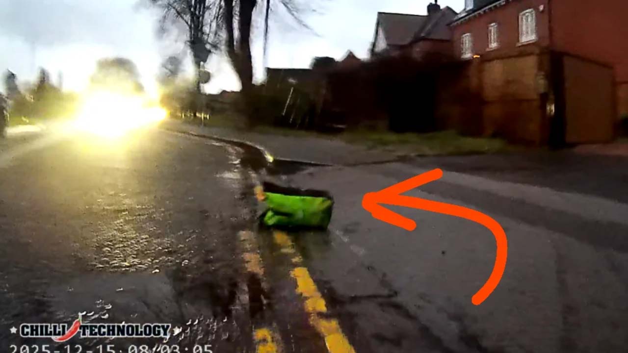 スレ主さんは後方を撮影していたカメラ(機種不明)を確認したところ、凹凸のあるセクションに自分のパニアバッグが落ちていることに気付き(冒頭の写真)、後日その近くの家をたずねました。