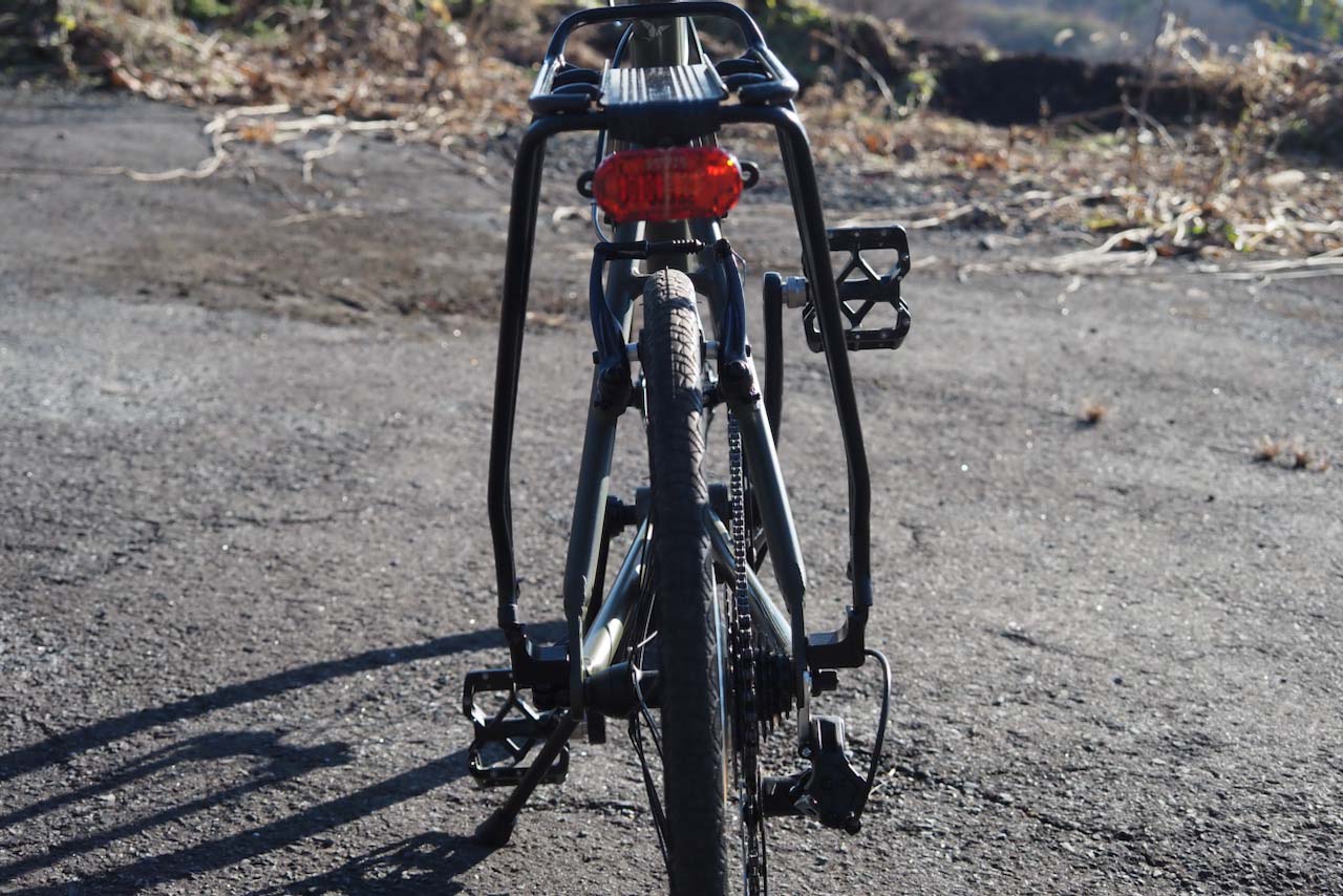 筆者のトピーク・エクスプローラーはたまたま「ディスクブレーキ対応型」なので、後方から見るとフレームがだいぶサイドに張り出しています。スリムに仕上げたい方はディスクブレーキ対応型でないバージョンを選んでも良いかもしれないですね。