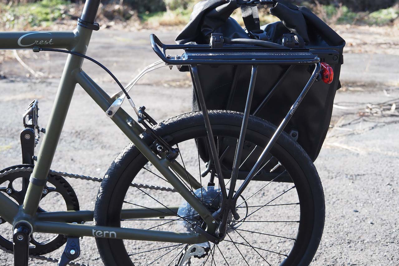 取り付けた結果がこちらです。トピークのエクスプローラーは同社のスーパーツーリスト系(紹介記事)に比べると後方への張り出し部分がない逆三角形のシェイプなのですが、これがTern Crestのシュッとした姿と非常に相性が良い、と個人的に感じました。