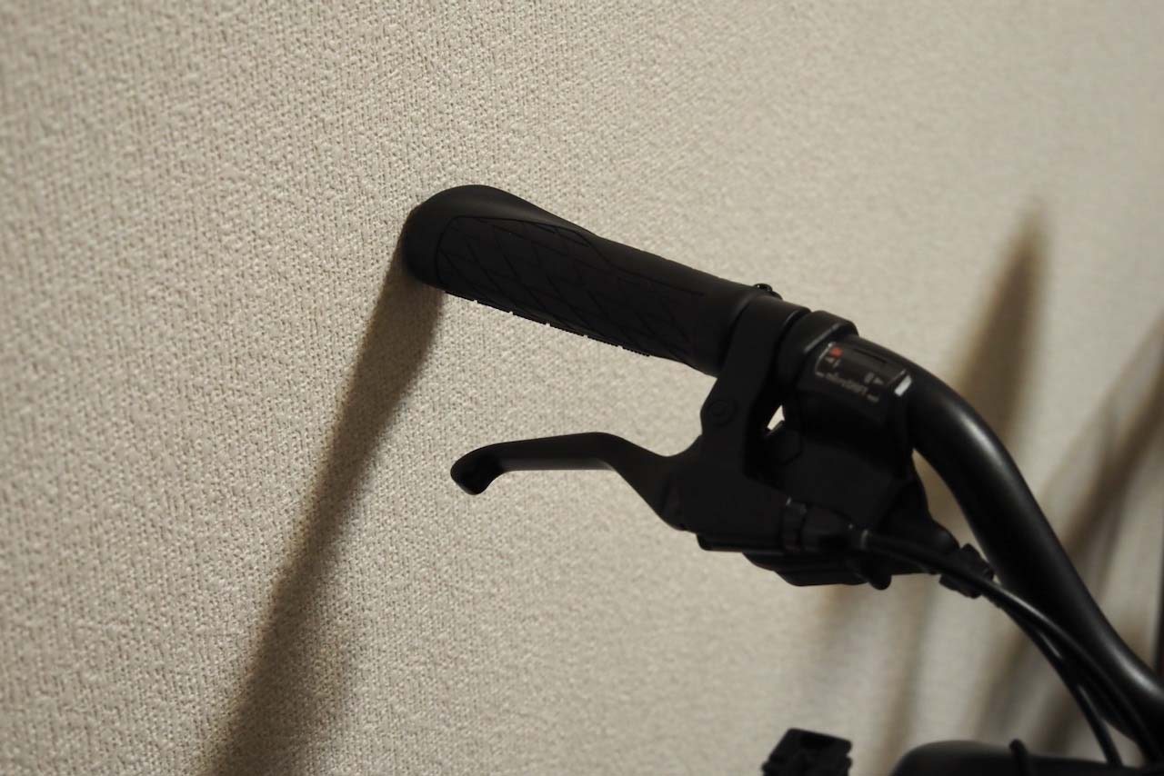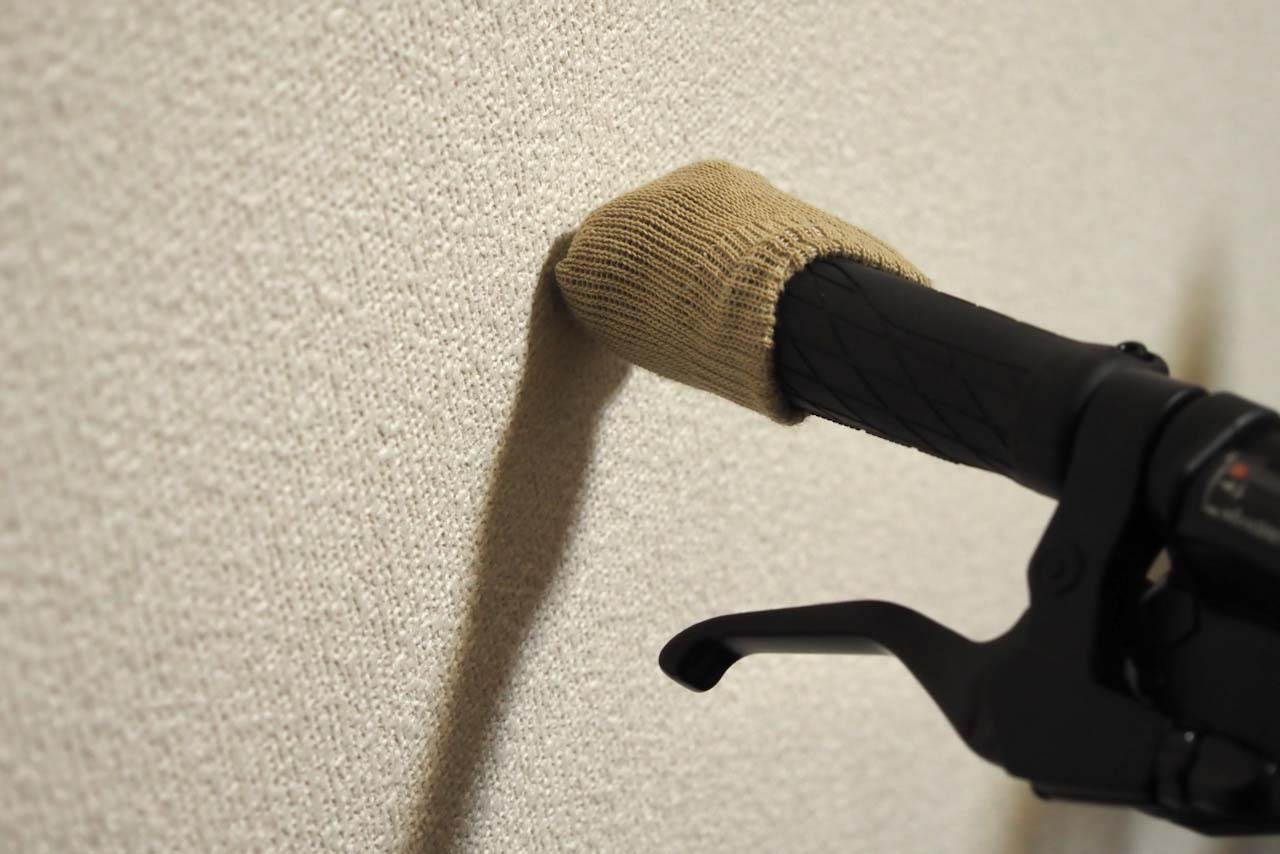 最近筆者が購入したばかりの小径車(Tern Crest 関連記事一覧)はハンドルがクルックルッと切れやすく、壁側に寄せて駐輪しておくとグリップがガンッとぶつかって黒い斑点ができてしまいそうです。しかもグリップの末端までラバーなのでやや心配。自転車があると白い壁はあっというまに汚れていくんですよね。