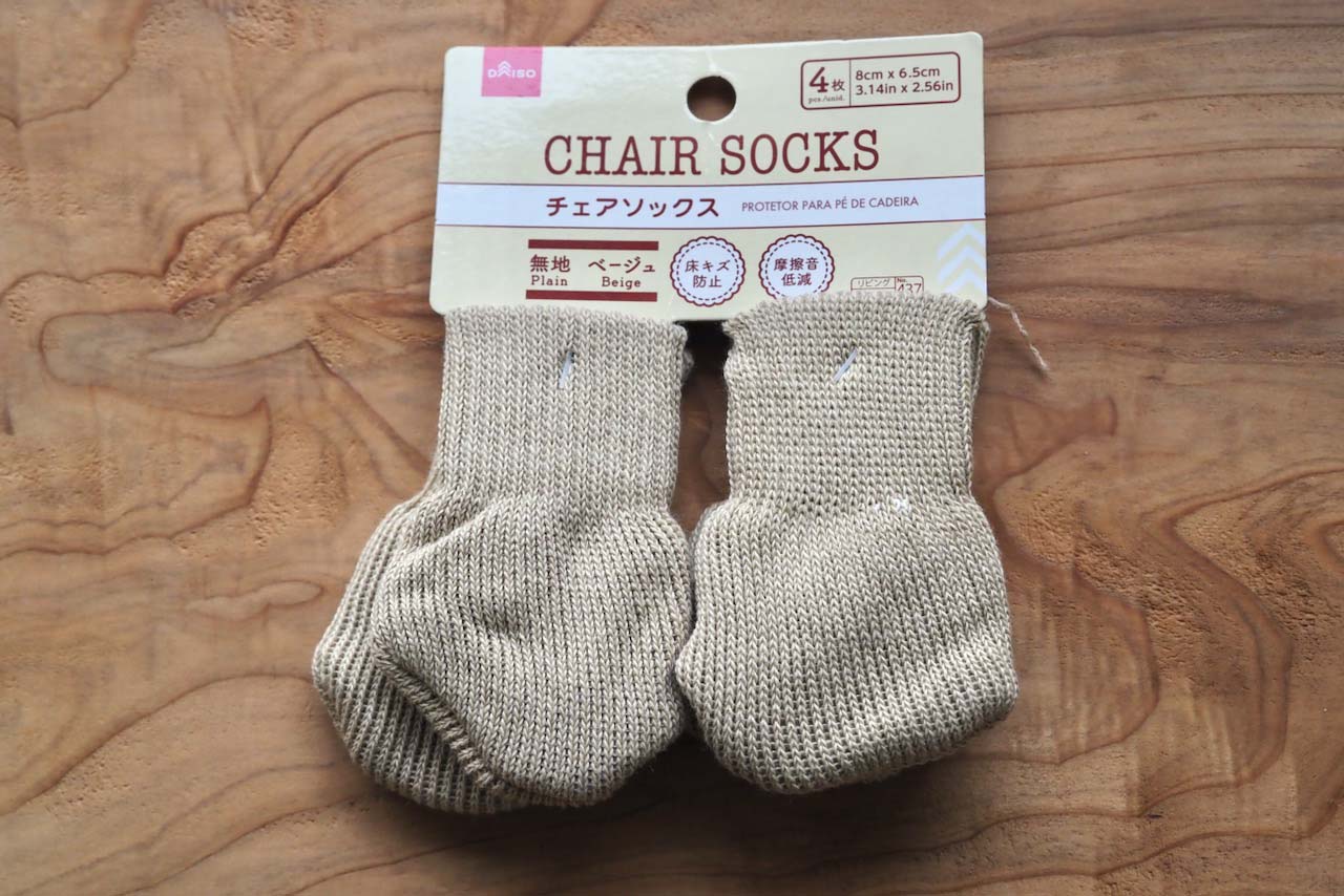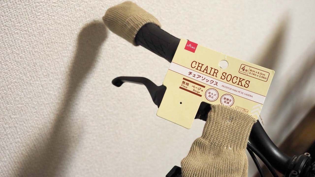 そうそう、家具用のソックス!! というわけでダイソーまでひと走り。100円で4個入っている「チェアソックス」なるものを購入しました。問題のグリップはウイング形状だったので、サイズがいちばん大きいものを選びました(グリップが普通の円筒形であれば通常サイズでもOKかと思います)。