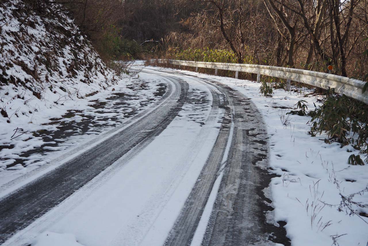 すると林道は奥に入るにつれて下のような雪道になっていきました。雪国の方にとっては「そんなもん雪道じゃねぇ」というレベルかもしれませんが、東京23区民にとってこれはウェザーニュースが赤帯放送になるレベルの気象災害です。電車が止まりコンビニから食品が消えるレベルです。