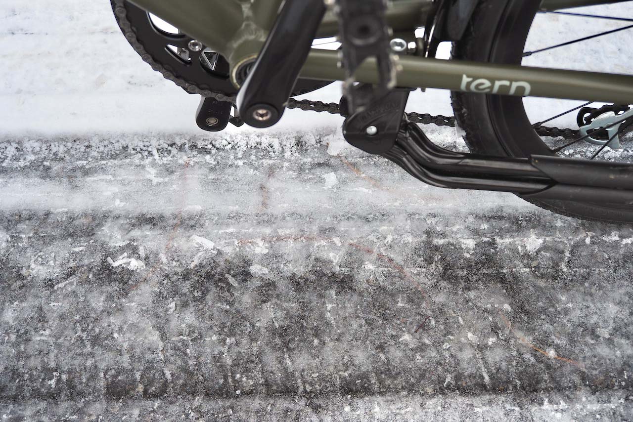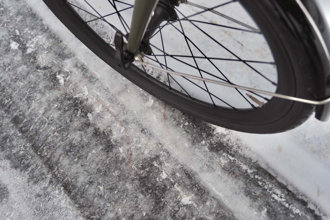 フカフカの雪とツルツルの氷とのあいだに氷が溶けて生まれた轍のようなラインを見かけることがあり、「そこを辿れば行ける」と試してみたところそれまた見事なトラップで、ほんの少しバランスを崩したらスッテンコロリンと低速転倒。坂道では転んだ姿勢のまま自転車と一緒にツーッと滑落していきました。こりゃ無理だ、普通の自転車では走れないんだなぁ、と理解した瞬間です。