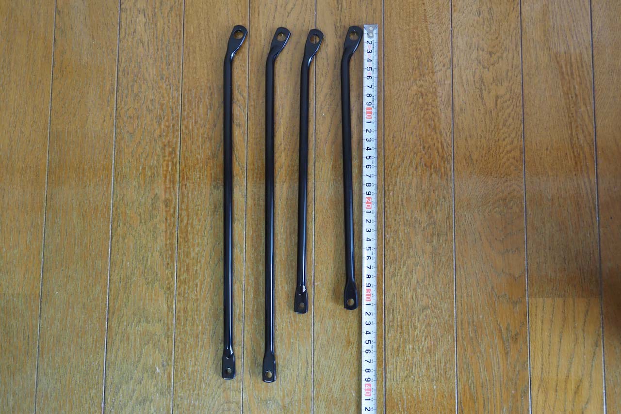 下の写真は、左側の2本が「トラスポーターラック」に付属する700Cバイク用のレッグ。右の2本が「アデプト ラック レッグ 20インチ用 ブラック(YCA03200) 」として別売りされているレッグです。今回は右の2本を使います。この20インチ用のレッグは、ボルト穴のセンター・センターで30cmという感じですね。700c用のレッグは37cmくらいだと思います。