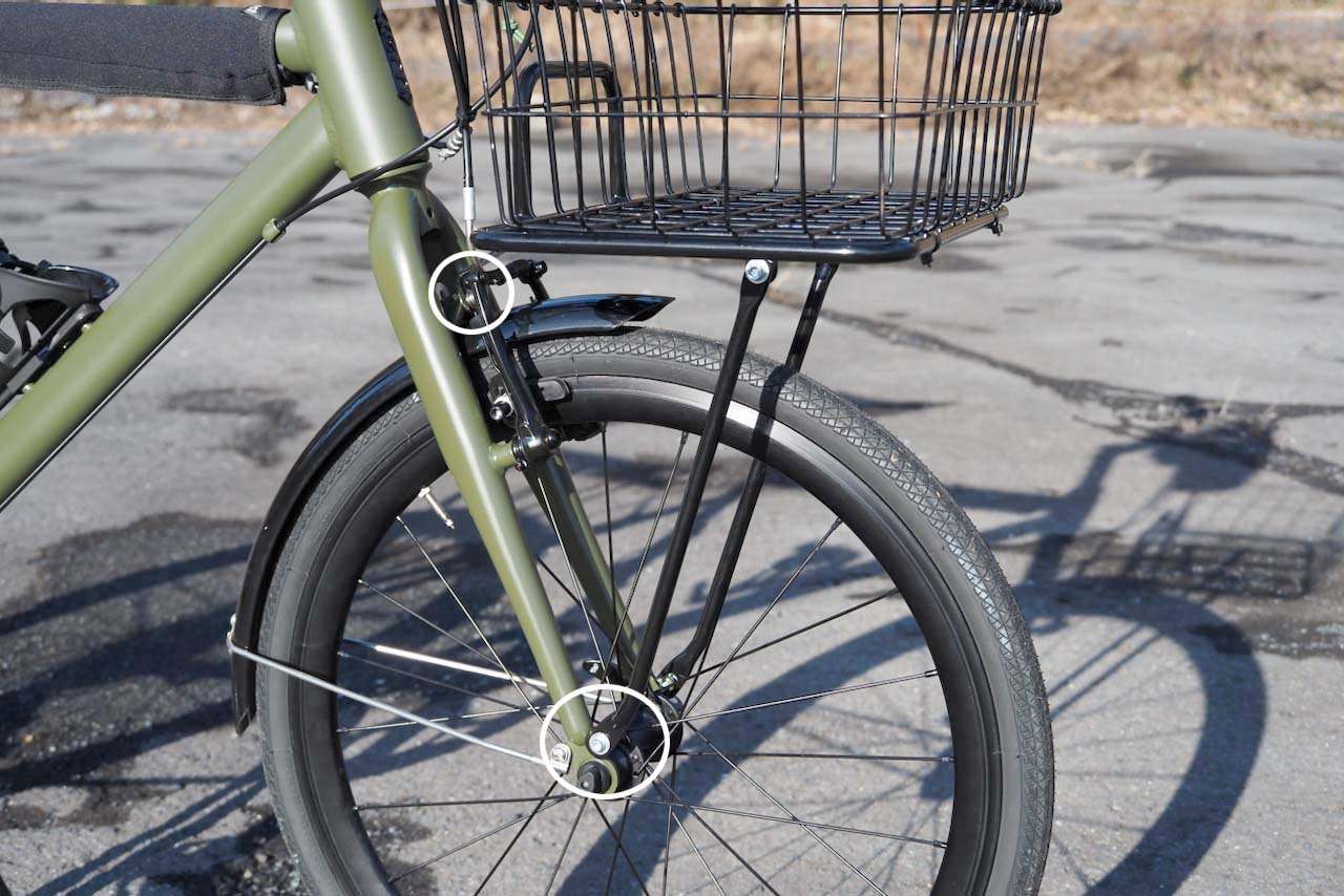 さて、「トラスポーターラック + 純正20インチ用レッグ」ですが、ほとんどTern純正品ではないかと思えるほど簡単に、かつ美しくCrestに装着できました。レッグはフォーク前側のダボ穴に。ラックからのブラケットはあさひの20型用ポリカーボネート製フルフェンダー(取り付け解説記事)と共締め。Vブレーキとの干渉もなく、見事に優勝。こ、こんなに簡単でいいのか…