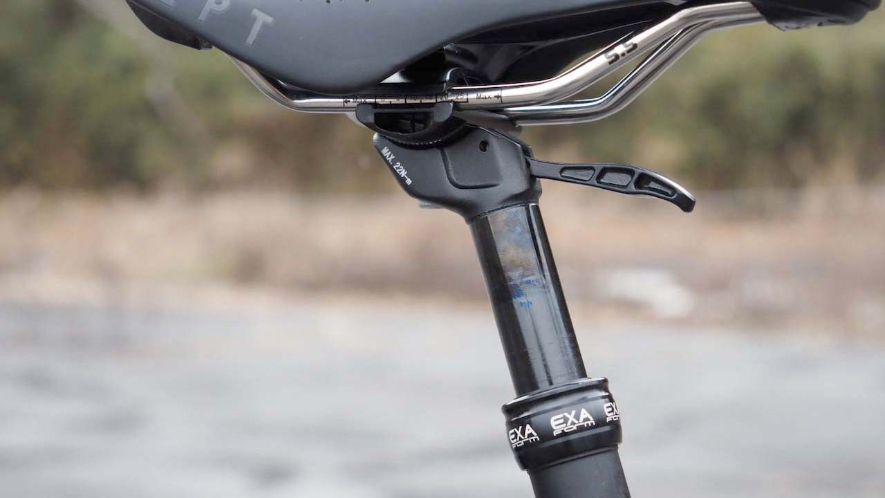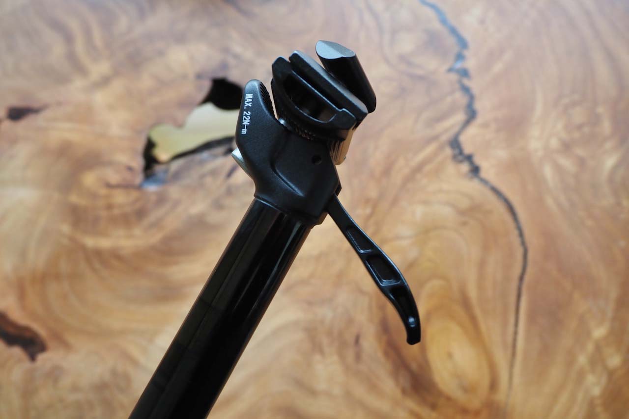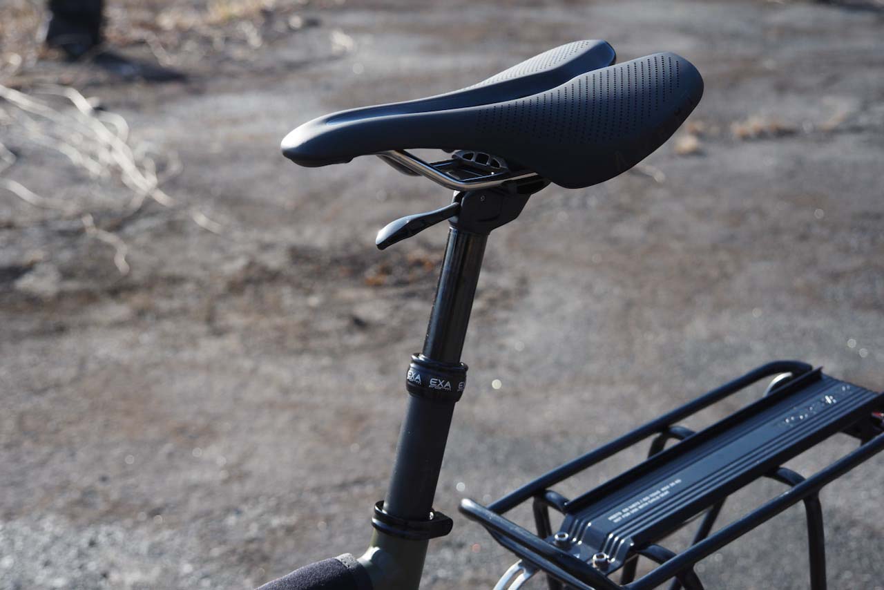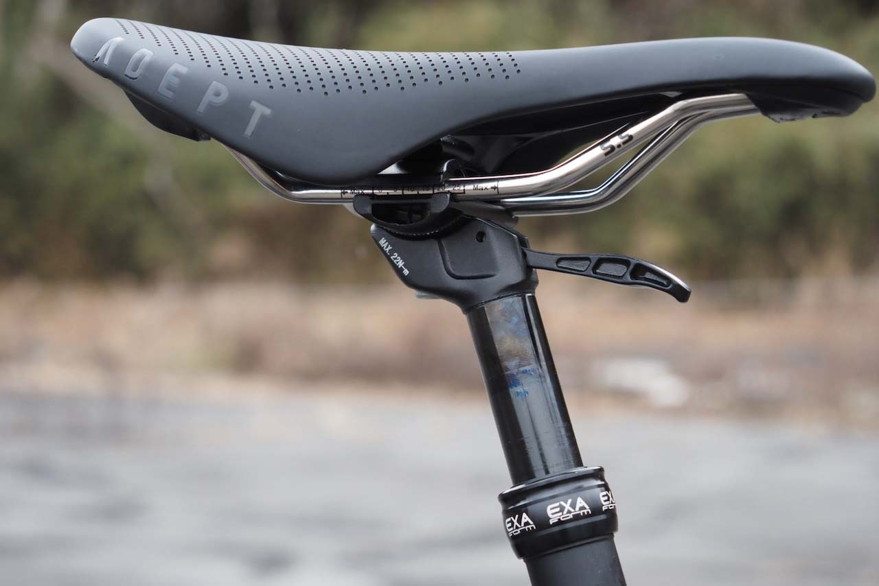 レバーを上下させることでシートの上げ下げができるタイプです(オフィスによくある油圧式チェアを想像してください。ああいう感じです)。ドロッパーシートポストとはどんなものか、配線要らずで気軽に試せるのはいいですね。ヤグラの刻みは十分にあり、サドルの角度調整も問題なく行えるタイプでした。全体的に質感は悪くなく、合格品質という手触りです。