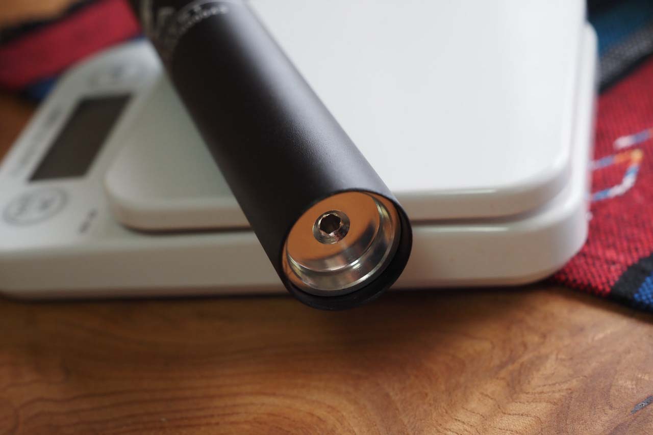 DJCのこのドロッパーシートポスト、Amazonの商品説明欄によると油圧式であり、底部のこのボルト穴を回すことによって動きの固さを調整できるとあります。しかしこの製品を分解したことがあるという方のレビューを読むと、これはエア式でこのボルトを回しても固さは調整できないとのことです。筆者は手持ちの4mmアーレンキーでここを回そうとしてみましたが、入りそうで入らないサイズなので、分解はできていません。そのためスペックの真相は不明です。