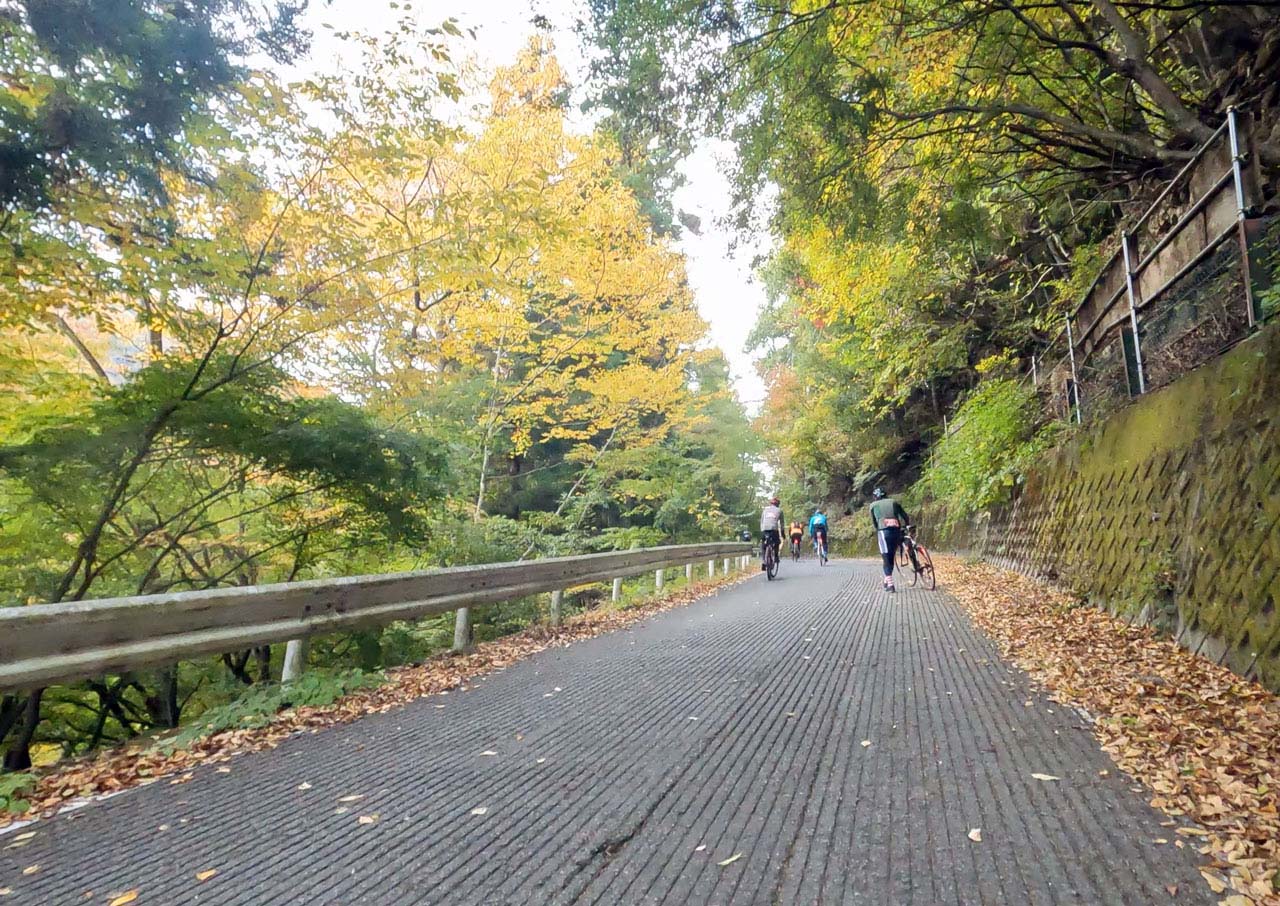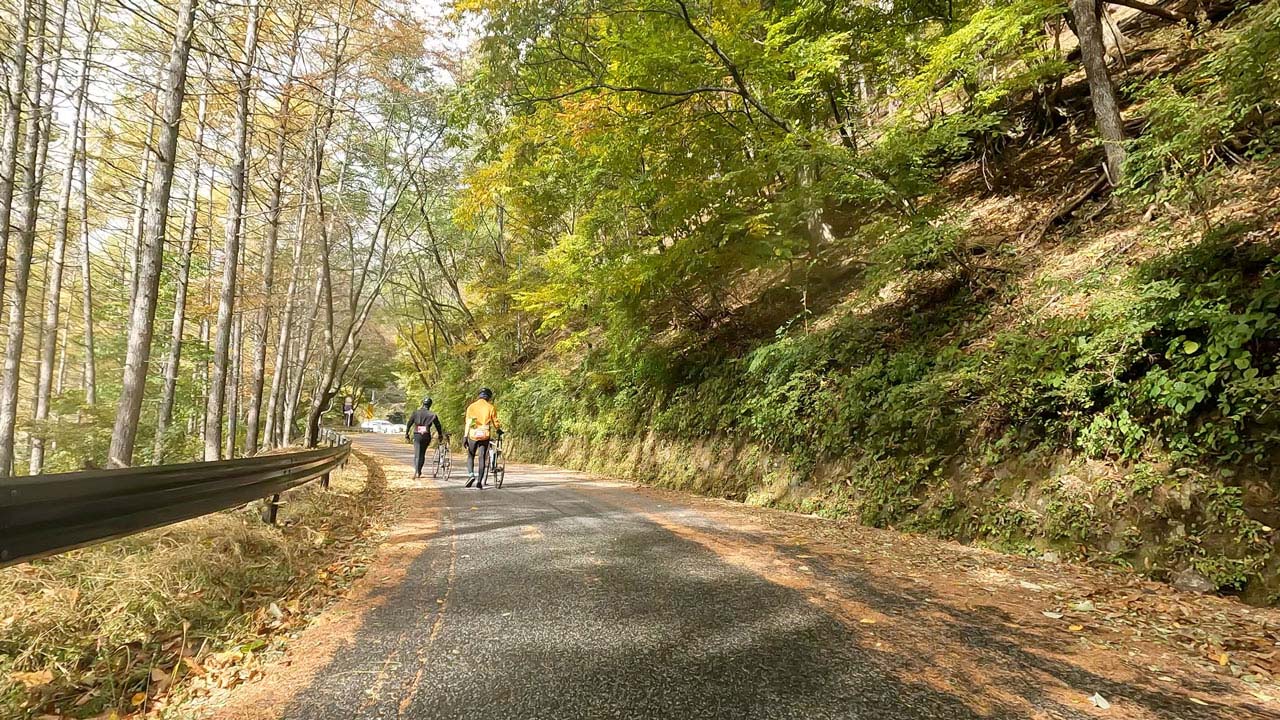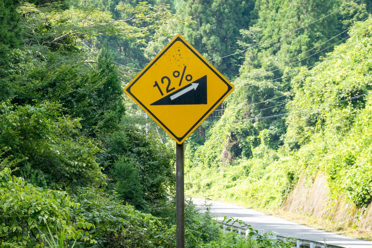 実にえげつないんですよ、斜度が! RWGPSのデータによると、最大斜度は21.6%。これ壁? 実際に走っていても10%台後半がカジュアルに登場してくるし、それが直線で果てしなく続いていて心がボッキリ折られます。