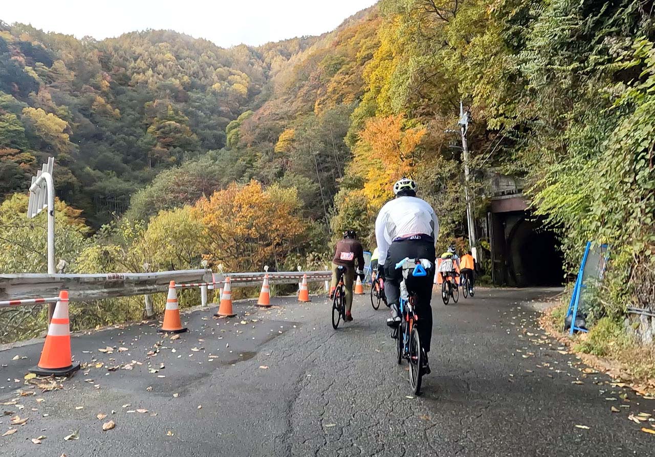 広河原のエイドステーションから先は、ダウンヒルゾーン。とはいえ、コーナーはキツいし道は狭いし、葉っぱや枝が落ちまくり。しかも不意にトンネル(照明なしで暗闇。しかもカーブしてる!)と遭遇します。下りなのに、ちっともラクチンじゃない!どゆことー!?