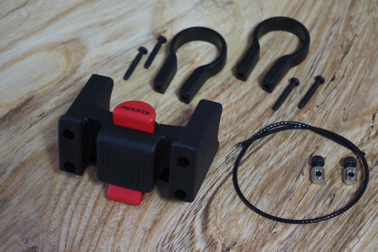 下の写真はフロントアタッチメント・型番KF852(31.8mmのオーバーサイズハンドル用)の全パーツです。アタッチメント本体とU字型のクランプでハンドルを挟み、ネジで固定する…のは説明書を見なくてもイメージできますが、右側のワイヤーと2つの小物金具は何のためにあり、どのように取り付けるのでしょうか。