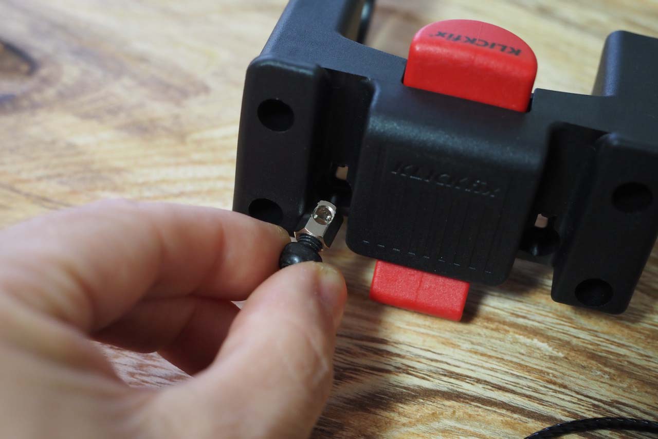 この小物金具はメカニカルブレーキワイヤーを通す穴のあるナットのような感じになっていて、ワイヤーを入れてからボルトを締めて固定するようになっています。この金具を穴が上を向くようにして、アタッチメント本体の左右のスロットにはめこみます。