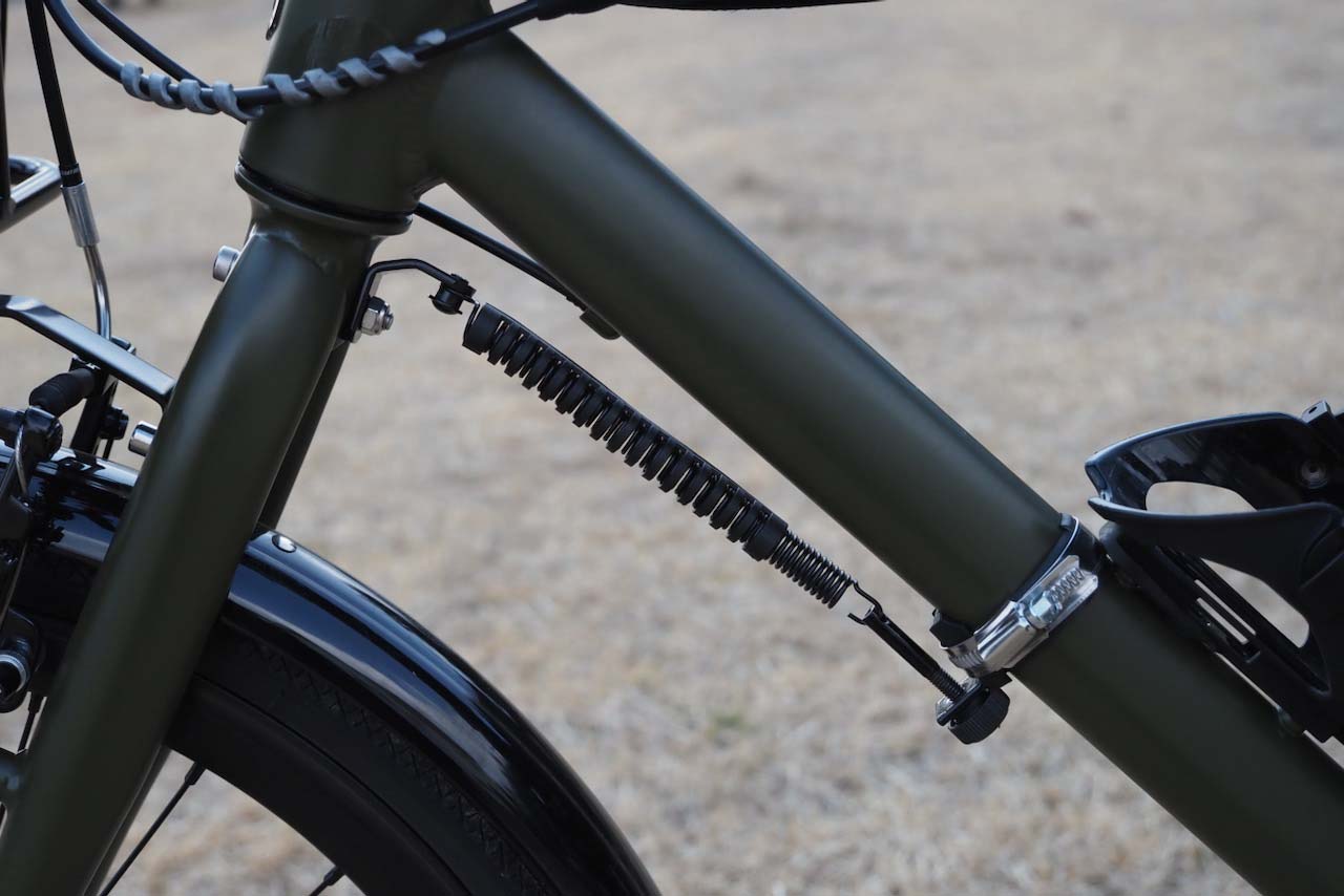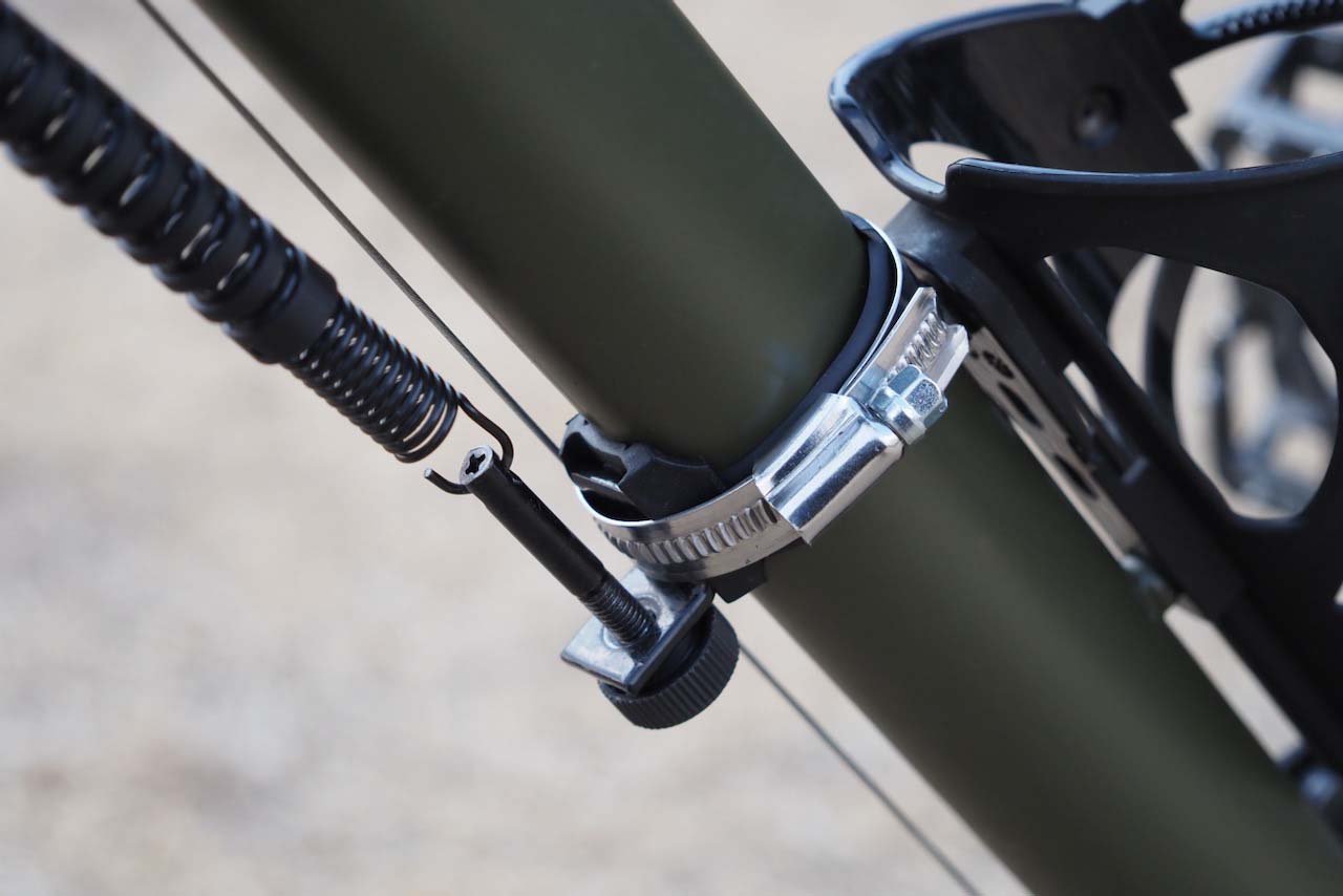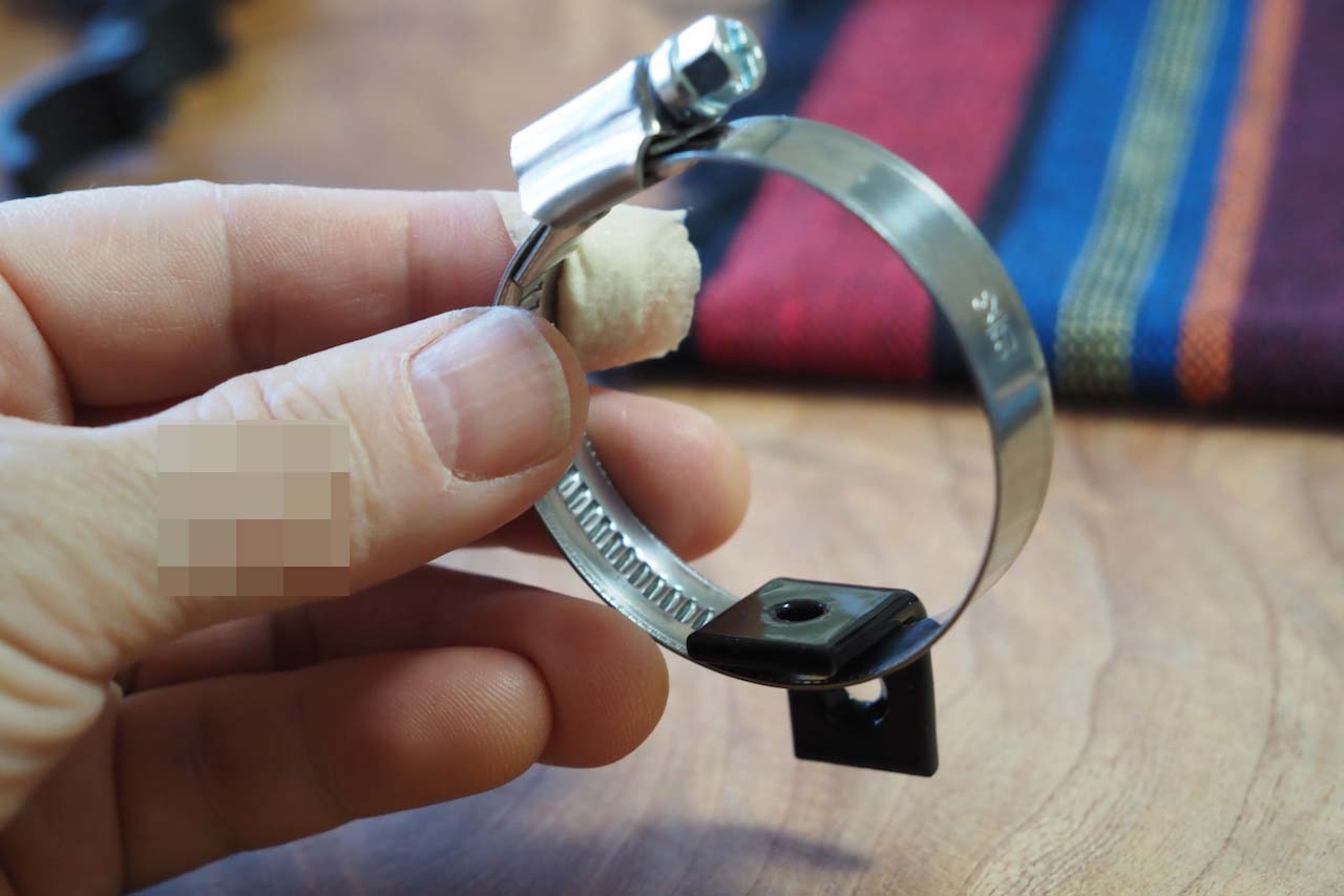 あとは取り付けるだけです。ホースクランプの金具の端が鋭利なので、ダウンチューブに傷が付かないように気を配る必要がありました。またこのクランプはドライバーで締めこんでいくのですが、なかなかの固さです。下に挟んだクッションやL字金具がずれないように、そしてバネに必要なテンションをかけられる位置を探りつつ、何度かやりなおししながらの作業です。