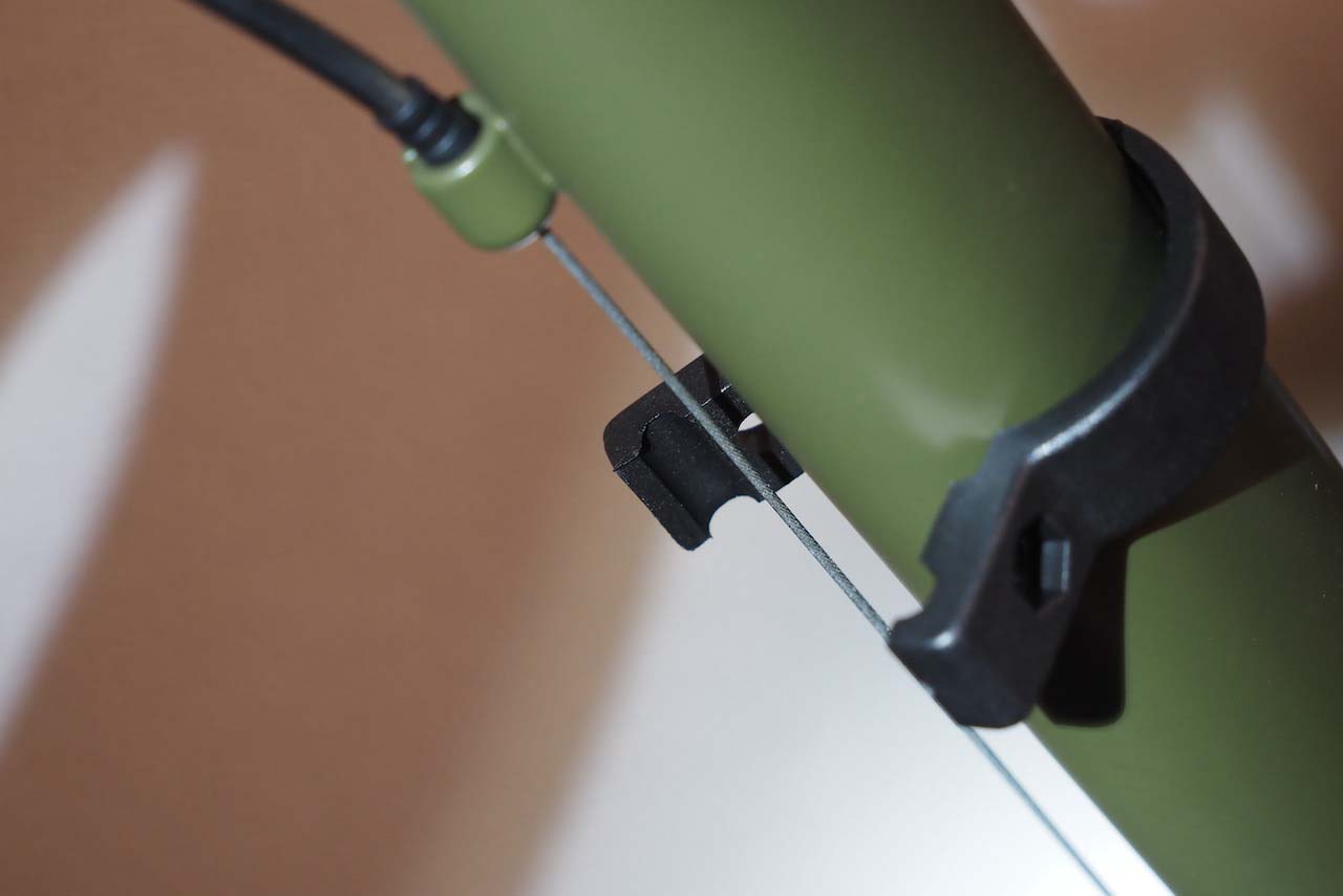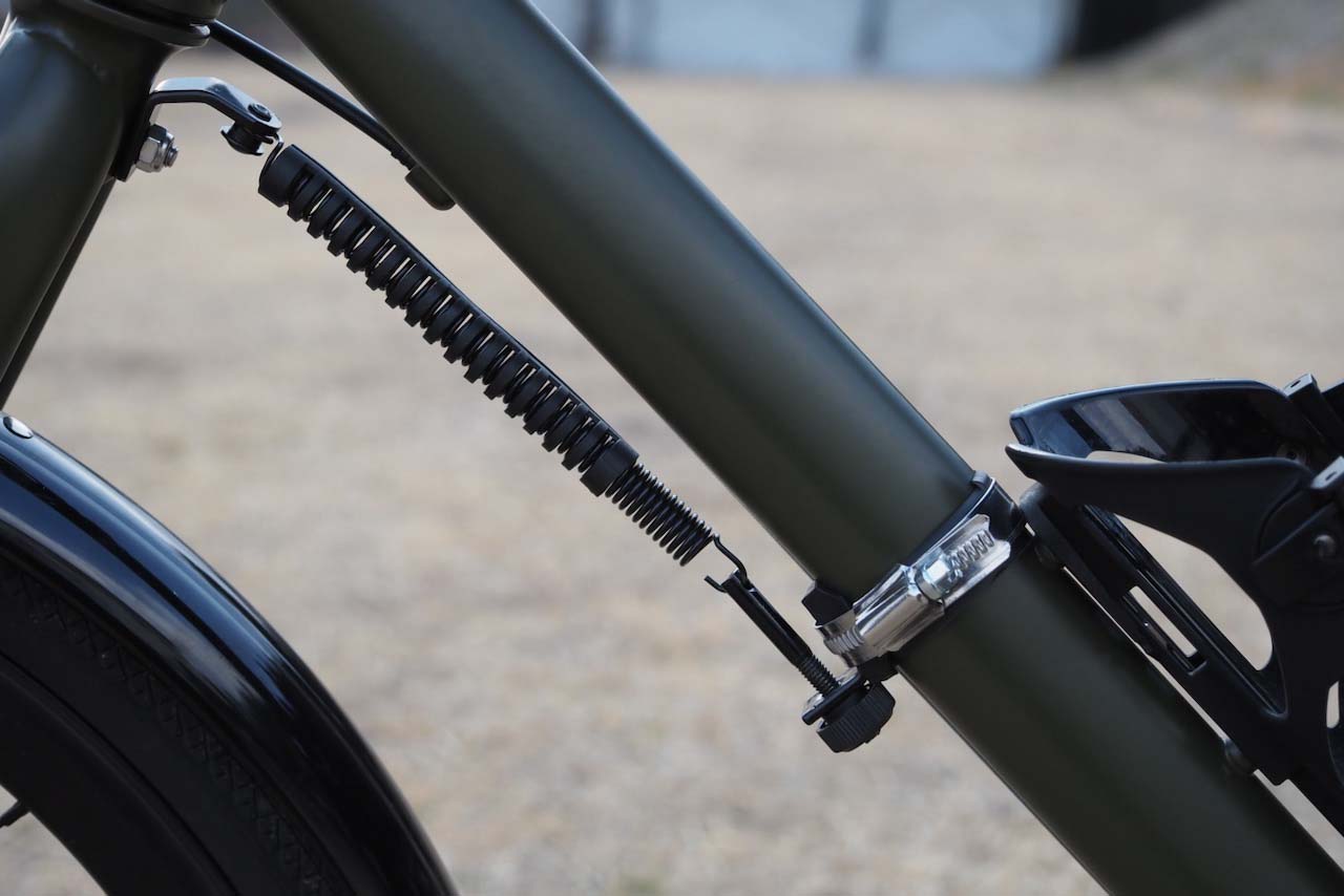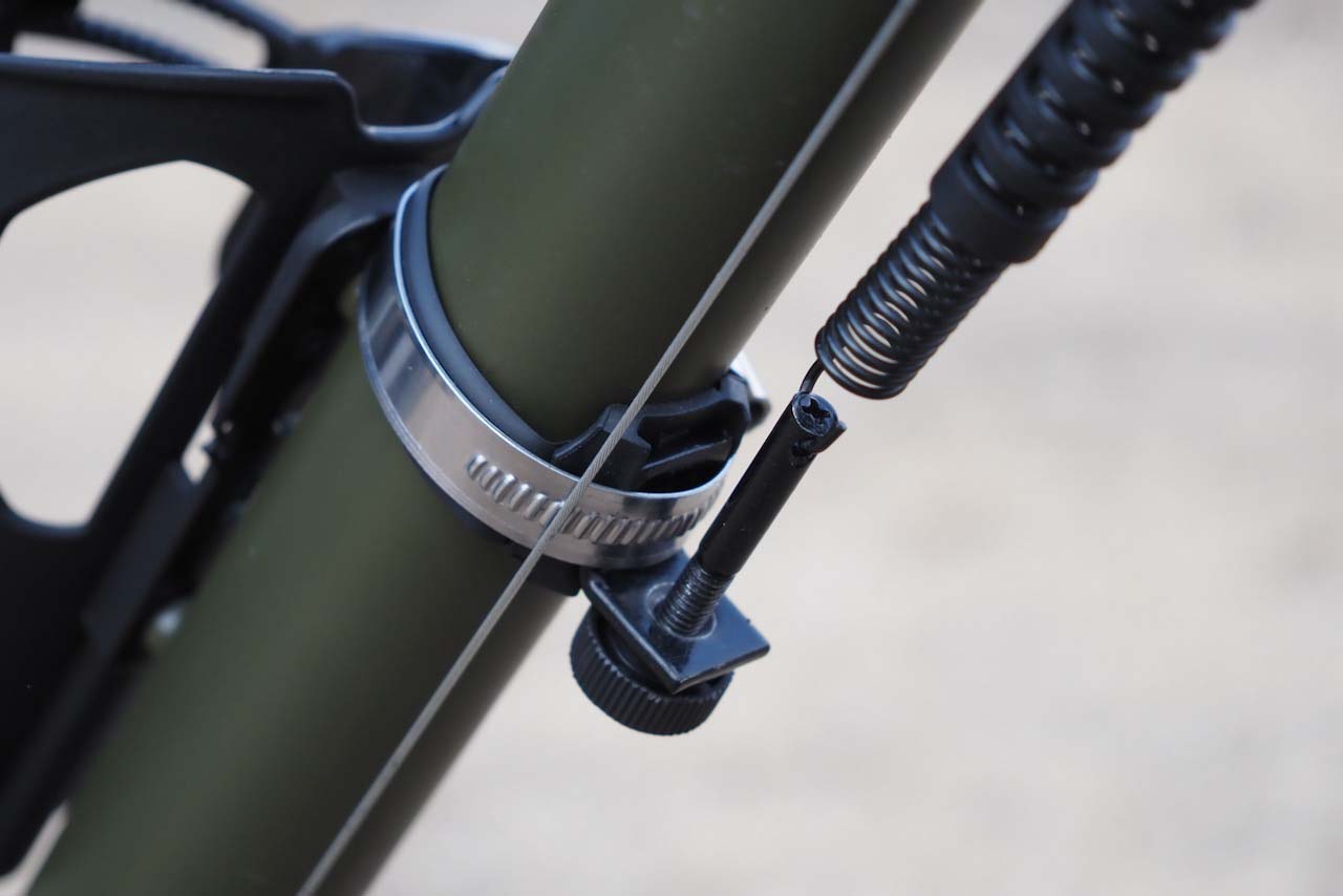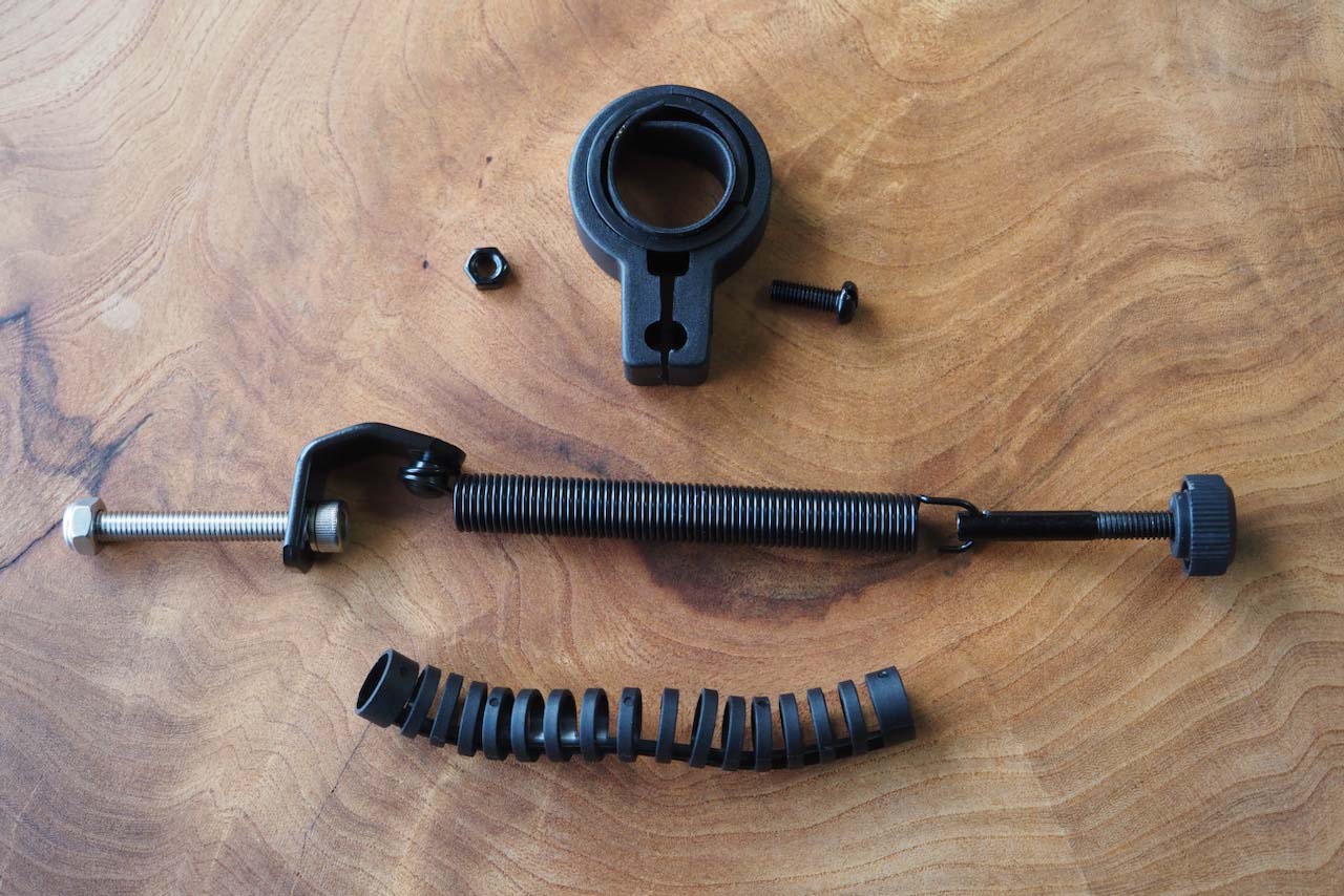あとは取り付けるだけです。ホースクランプの金具の端が鋭利なので、ダウンチューブに傷が付かないように気を配る必要がありました。またこのクランプはドライバーで締めこんでいくのですが、なかなかの固さです。下に挟んだクッションやL字金具がずれないように、そしてバネに必要なテンションをかけられる位置を探りつつ、何度かやりなおししながらの作業です。