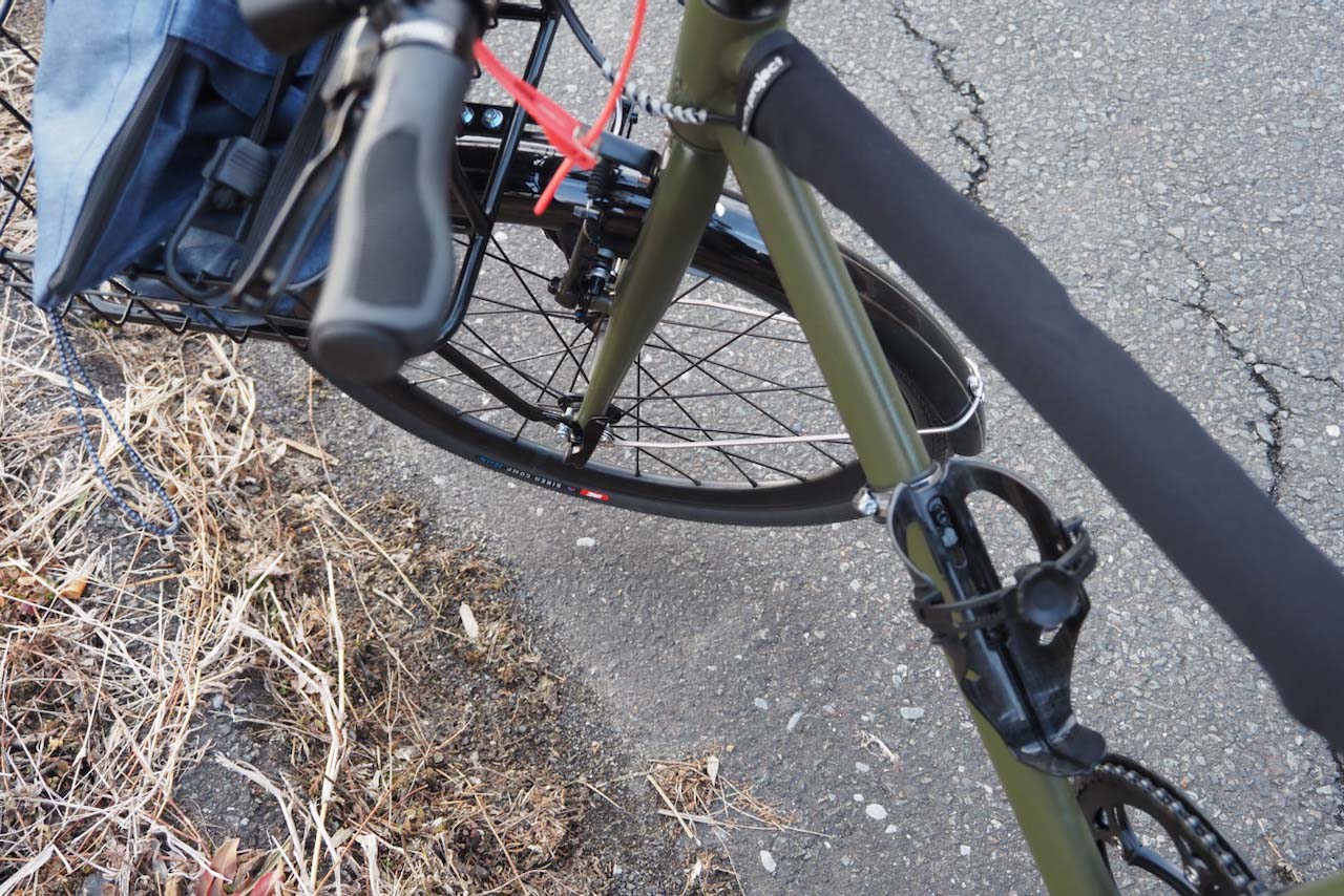 Velo Orangeのホイールスタビライザーを使うことで、駐輪中のハンドルの左右への振れはかなり軽減されました。フロントを持ち上げてホイールを浮かせてみても、下の写真の程度にしかハンドルが曲がりません。ただ、これはハンドルバーバッグなし・バスケットにも荷物がない状態の話。荷物があると、もう少しハンドルは振れます。完全無欠なソリューションではないようです。