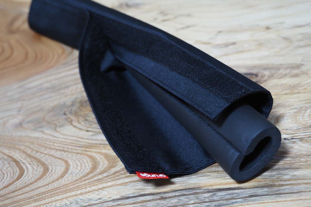 grunge製品のほうは、中の緩衝材を使わないのなら太いチューブにも巻けます。ただし緩衝材を使わない場合、外側のプロテクターは自転車を傷から守ってはくれるものの、担ぐ時の疲労軽減にはあまりなりません。rin project製品は単体でもある程度の痛み軽減効果もあります。