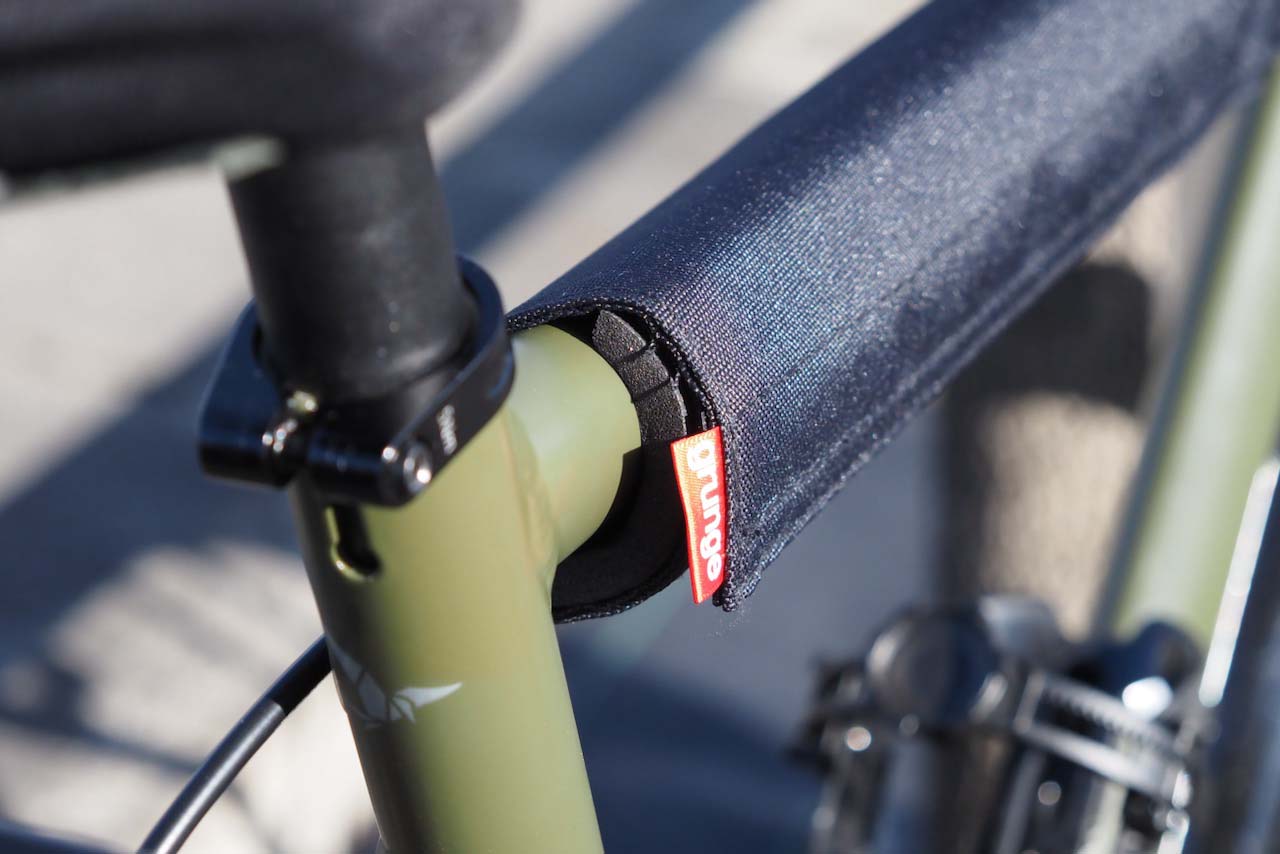このちくわのようなパッドは厚みが約1cm、長さは外側のカバーより約1cm短い感じです。外側のカバーと一体化しているわけではなく、トップチューブにかぽっとはめて外側からプロテクター本体で巻くだけ、という原始的な仕組みです。