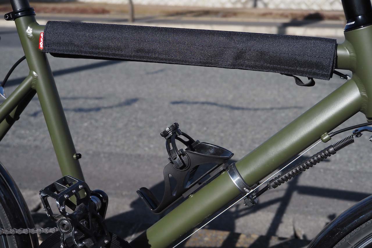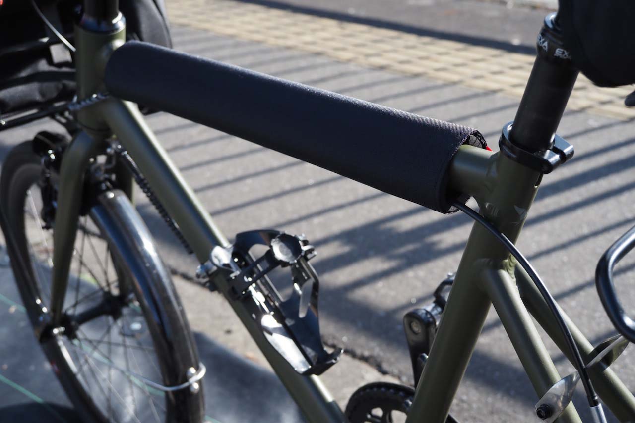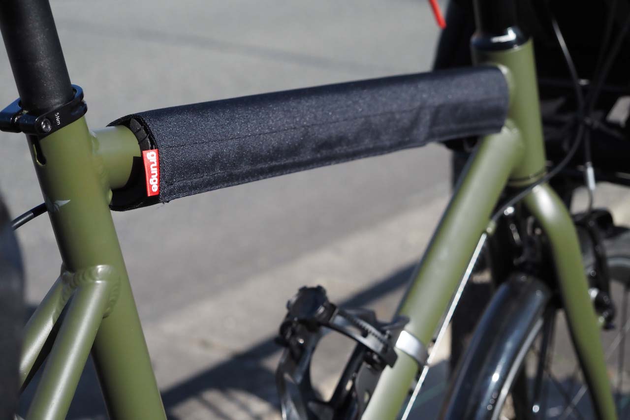 Tern Crest(関連記事一覧)にgrungeのトップチューブプロテクターを装着すると、下のようになります。rin projectの製品に比べると相当厚みがあるので、だいぶボテッとした外観になります。見た目の好みはかなり分かれるかもしれません。BMXみたいですね。