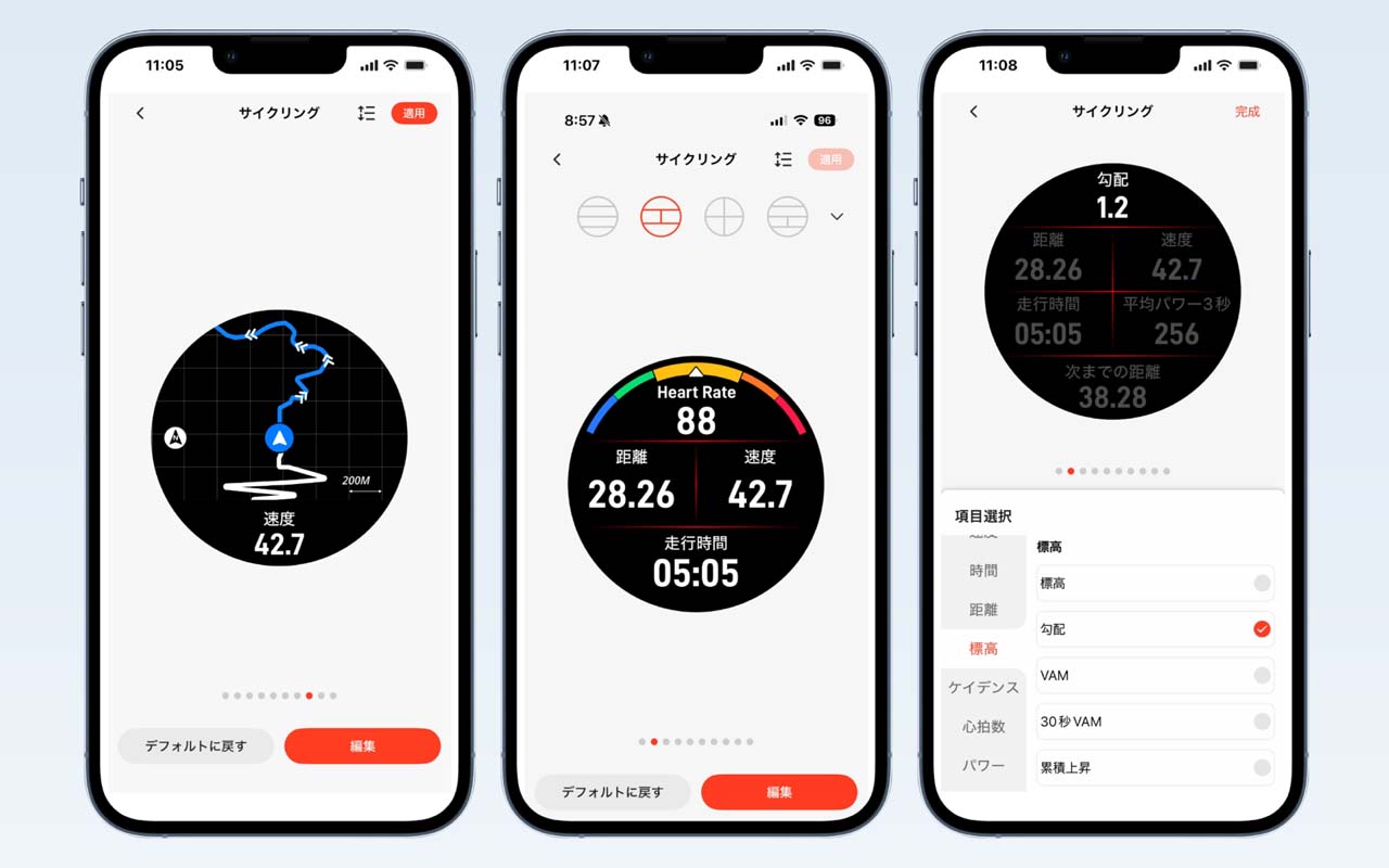 VeRunスポーツウォッチは「サイクリング」「屋内サイクリング」「自転車通勤」「サイクリングツアー」の4モードで自転車用途に対応。切り替え表示できる画面の内容が、それぞれのサイクリングシーンに最適化されています。