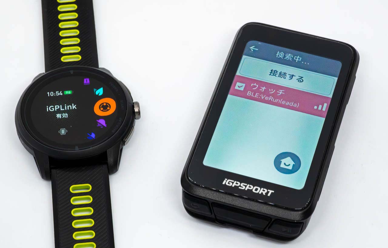 頭上に無数の疑問符を浮かべながらVeRunスポーツウォッチのほうを見てみると、メニュー内の「iGPLink」が思いっきり「無効」になっていました。そりゃ接続されるわけありませんよね! 画面タップ/メインダイヤル押下で「有効」に切り替えると、あっさり接続できました。