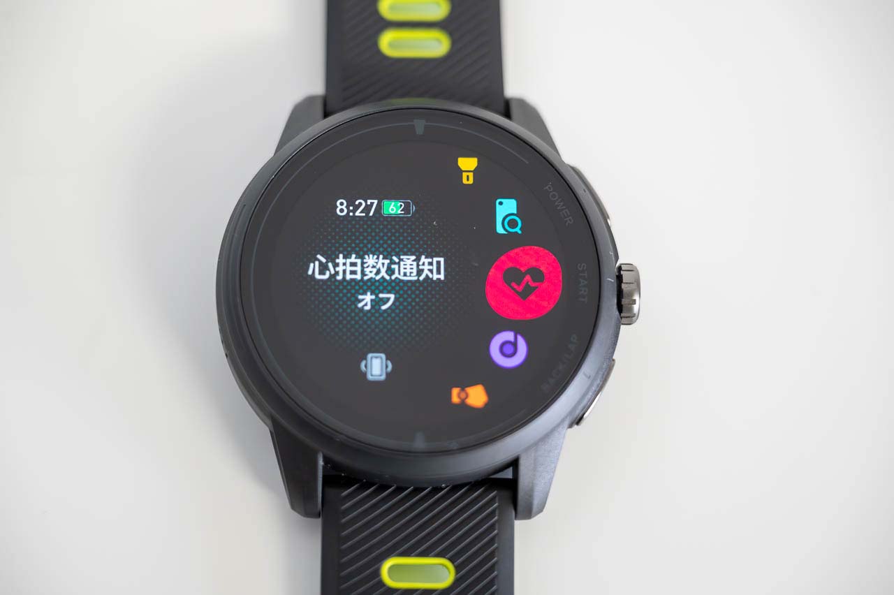 ちなみにVeRunスポーツウォッチが心拍データを送信しているときは、盤面の上部にハートレートのマークが表示されるので通信中であることが一目瞭然。万一、ライド後に設定をオフにし忘れても、たちどころに気づけるはずです。
