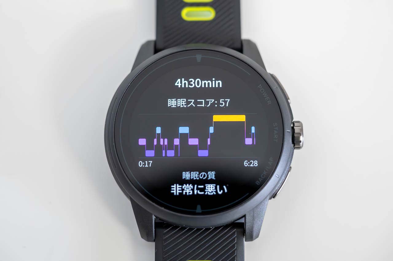 ロック解除後にメインダイヤルを回すと、まず表示されるのが就寝中に計測したデータをもとにした、睡眠スコア。いきなり「非常に悪い」判定を喰らってしまって、大ショック。