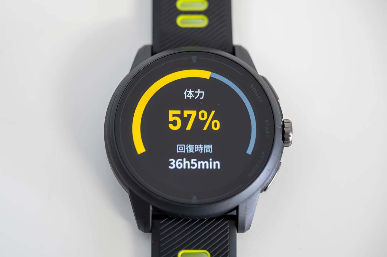 そして体力スコアと回復時間が表示され、身体のコンディションがわかります。これは200kmブルベを走った翌々日の数値ですが、まぁ老体が2日で完全回復はしないですよねー。