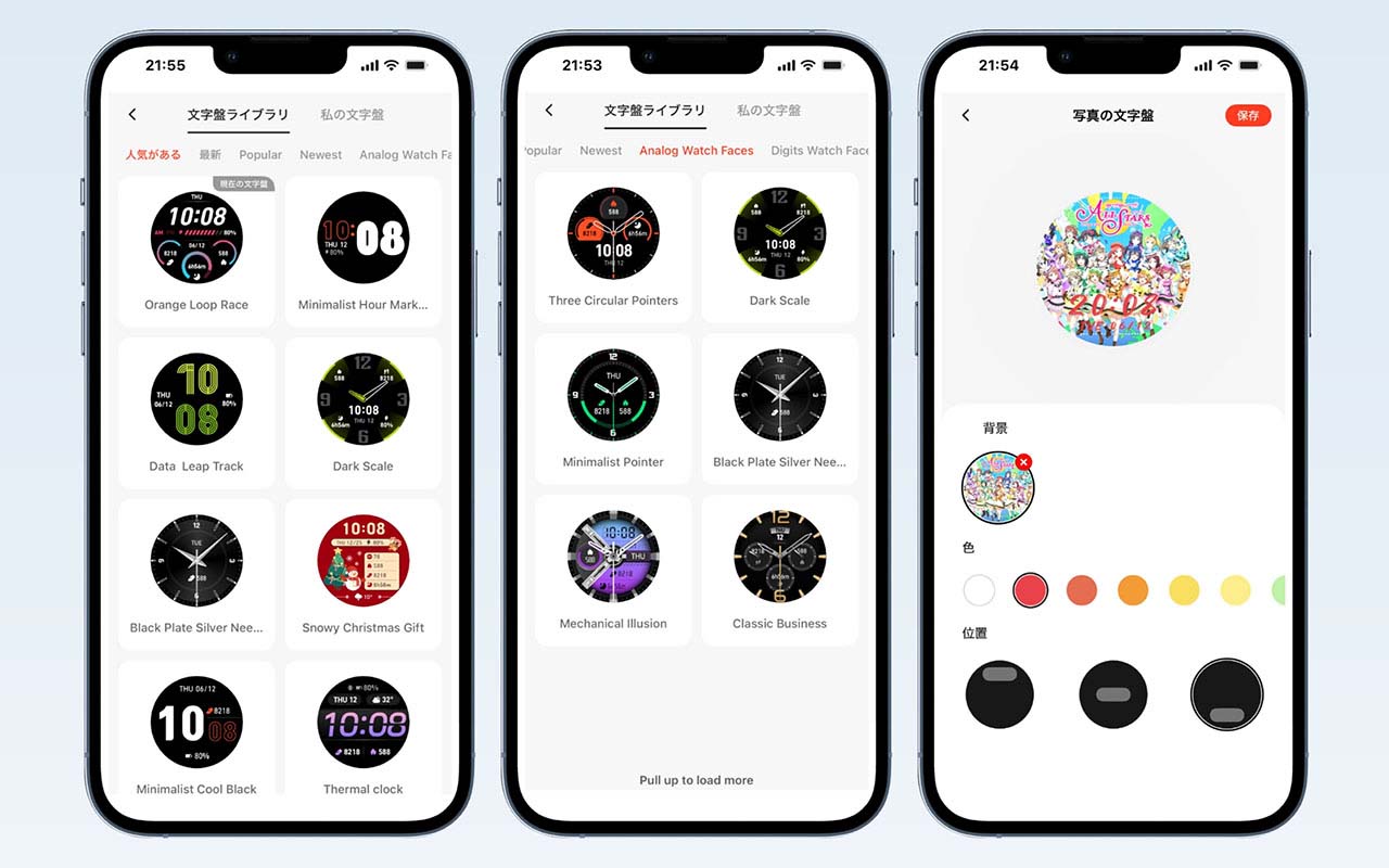 文字盤のデザインも豊富に用意されていて、いかにもスマートウォッチ然としたものからアナログ風までが選び放題。カラーパレットや、表示項目の変更も可能です。自由度はまだ低い状態ですが、オリジナル文字盤の作成機能も用意されています。いろいろカスタマイズして、好みの1台に仕上げられるでしょう。
