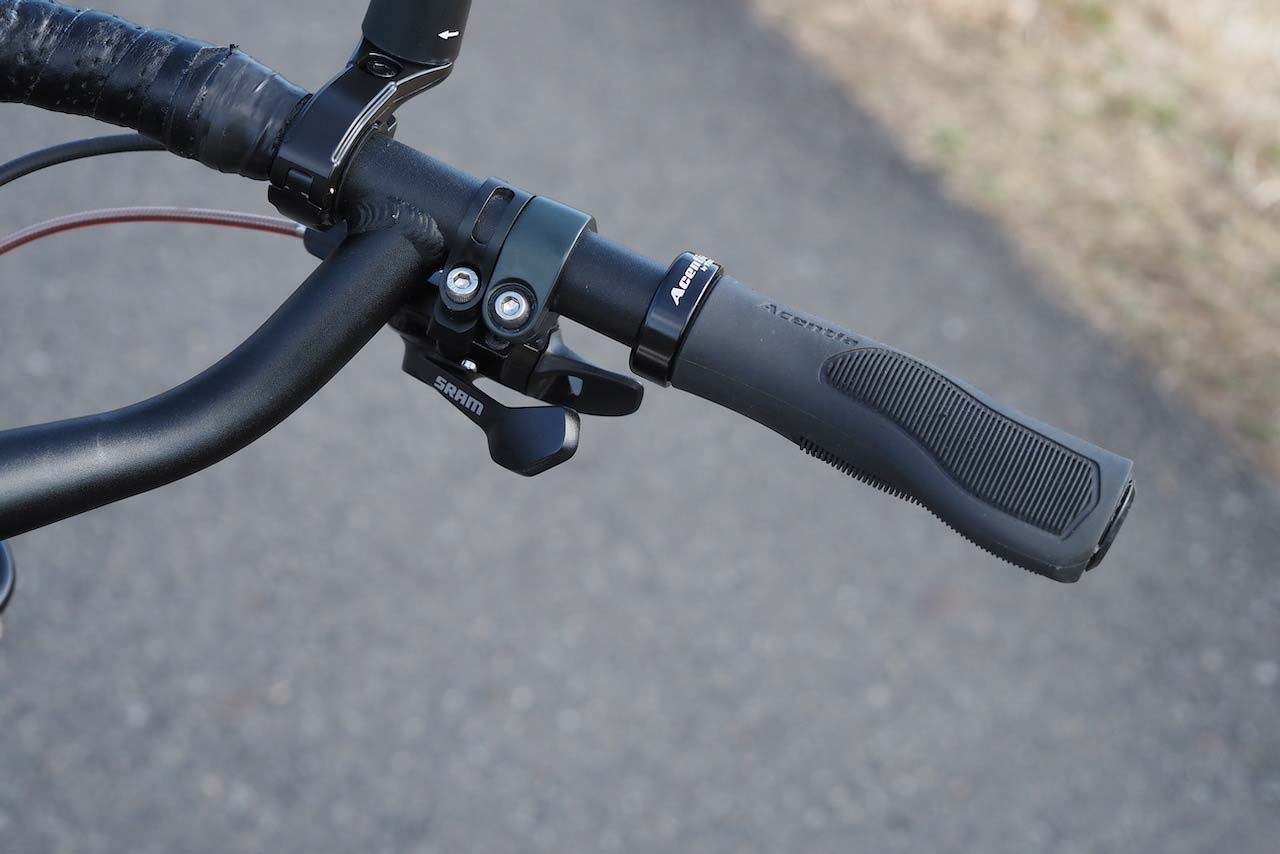 カット後はバーテープを新しいものにしようといくつかの製品を用意していたのですが、最近このバイクでは様々なシフターやブレーキレバーを取っ替え引っ替えしているので、暫定的にTIOGA Acentia Eグリップをはめてみたところこのハンドルとの相性がかなり良いことがわかり、しばらくこのままで運用することになりそうです。