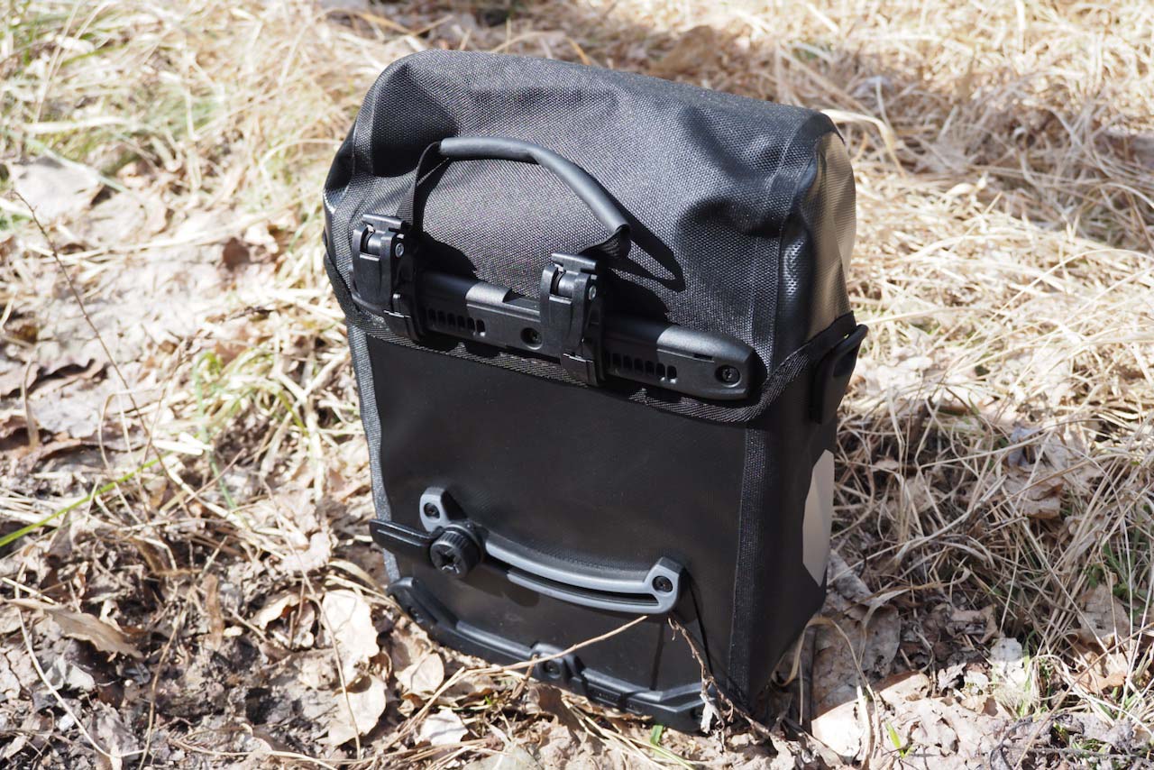 背中の様子です。オルトリーブの最もスタンダードで使いやすい「QL2.1」システム採用で、同社製の他のパニアと違っているところはありません(グラベルパックだけ下側のフックがオフロードでの脱落対策としてダブルになっているのが特殊なパターン)。