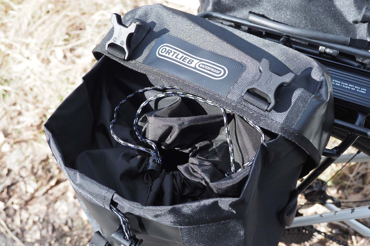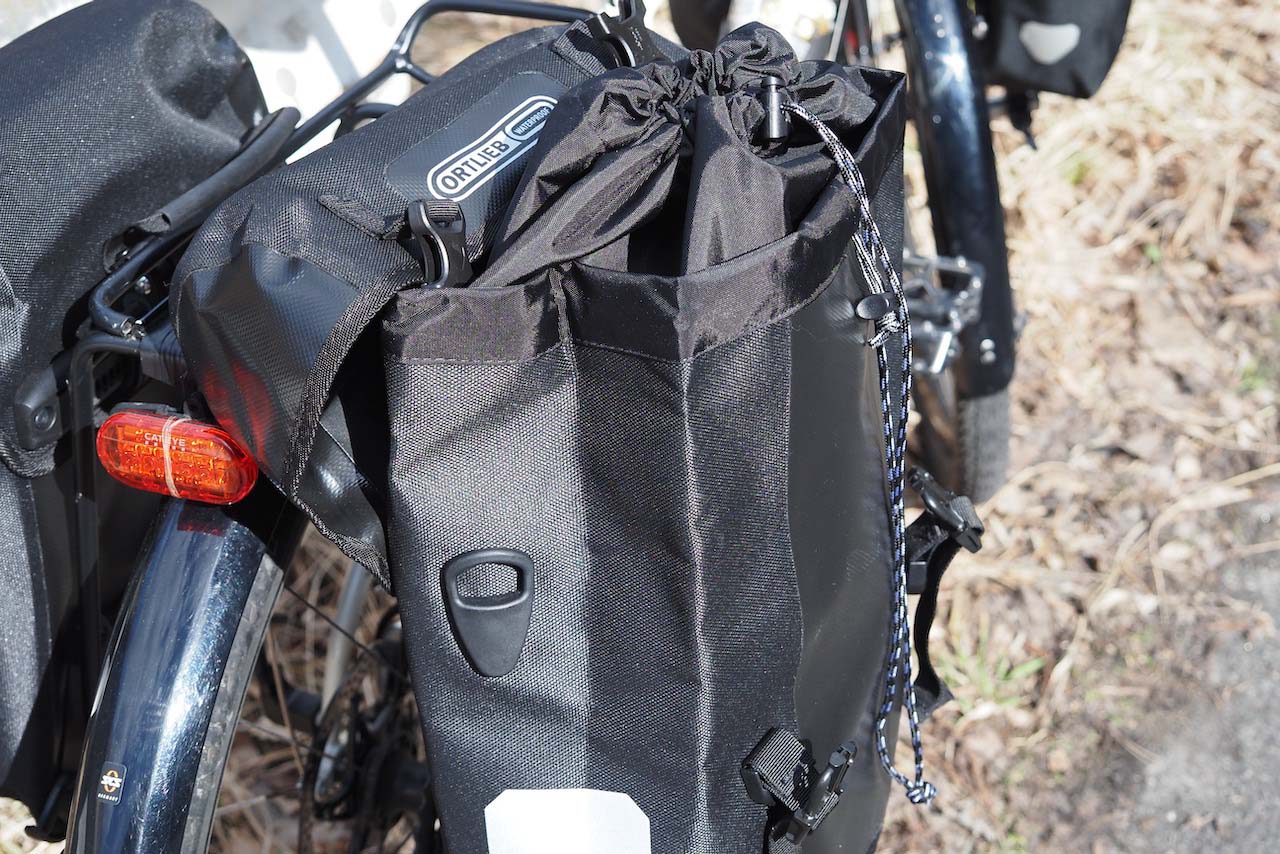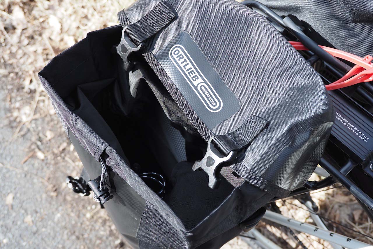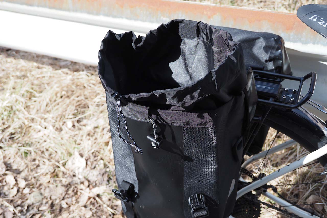 構造的には雨蓋付きの登山用ザックと同じです。外側のバックルを2つ外して、内側の巾着にアクセスしてガバッと広げる、という仕組み。手数的には3アクションで、ロールトップタイプのパニアを開くのとほぼ同じか、やや手間取る・やや負けているかもという感じです。意外にもスポーツローラー系の伝統的なロールトップのほうが実は早くて簡単なのではないか、と思わされました。