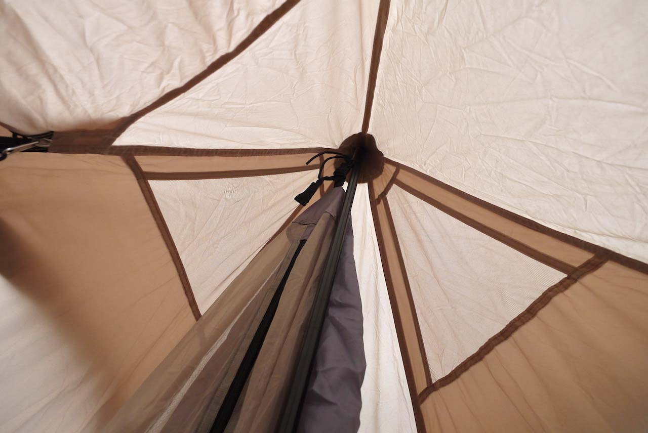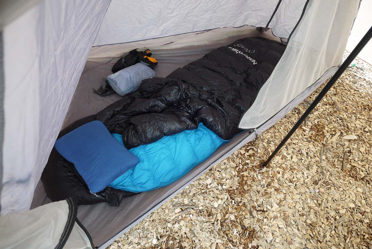 寝袋や枕を展開してインナーの中に放り入れ、カラスや猫等の野生動物に狙われないよう食料を入れ、身の回り品も中に。パニアバッグを数個入れても窮屈に感じない広さがあります。また、天井が高いので内側で動く時に腰への負担が少ないのもこのテントの長所です。