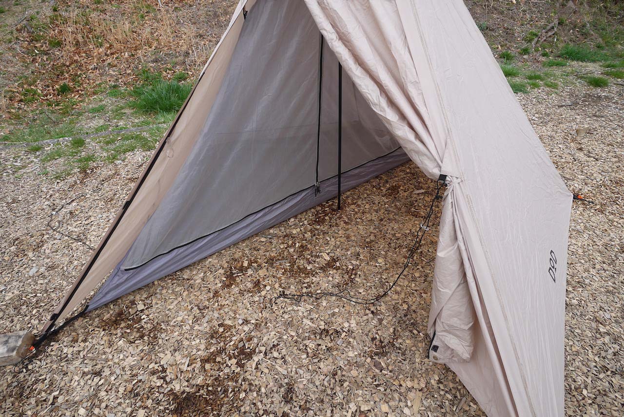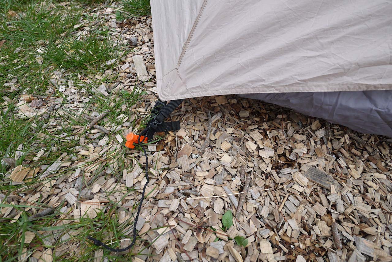 設営時はインナーテントの下に水が流れこみにくい地形を選ぶのが良いでしょう。暴風雨では雨が吹き込みやすい構造なので、そこは納得した上で運用します(本当にやばい時は枯れ木などを持ってきてフライ下の隙間を塞ぐと良いでしょう。スカートを自作して取り付けるのもアリではないかと思います)。