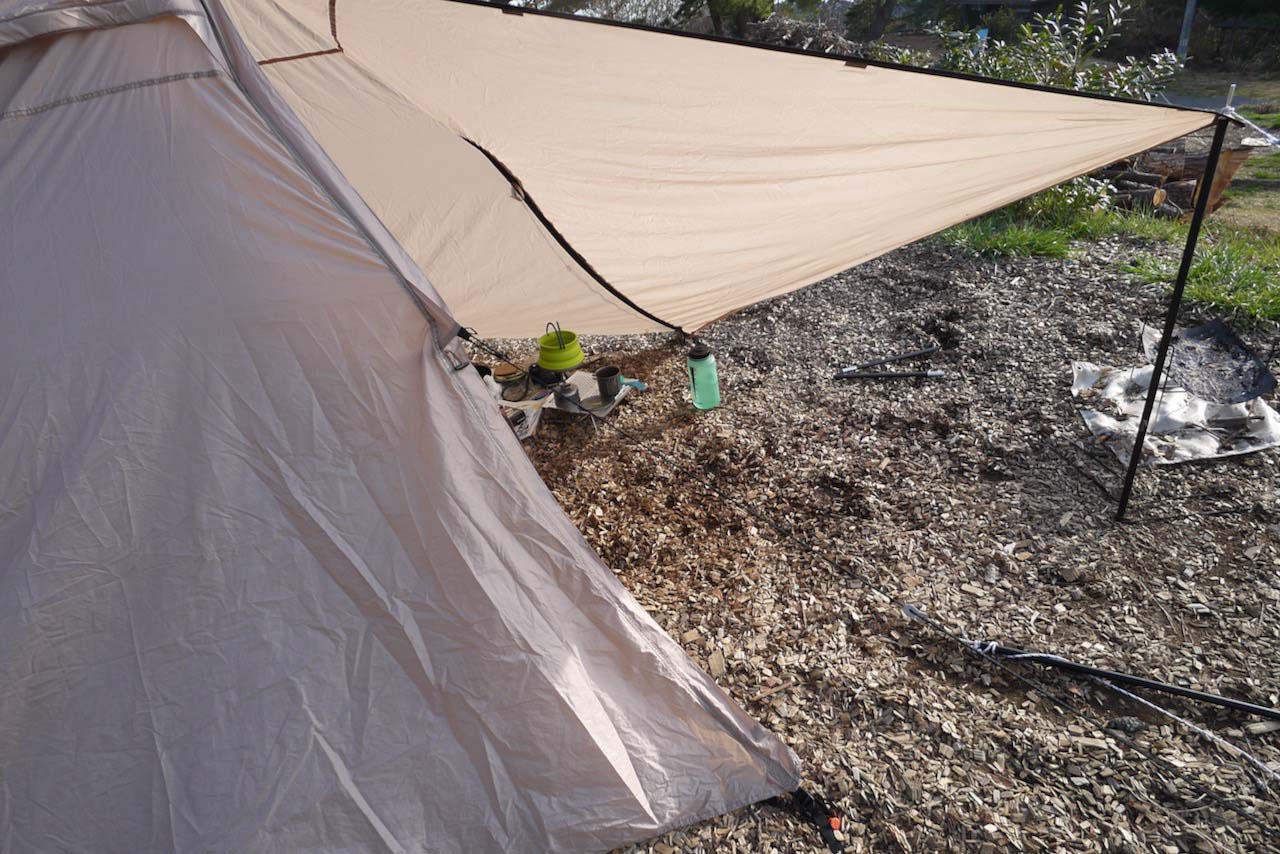 入口ドアの両サイドを開いてポールを2本立てれば、立派な前庭の完成です。日陰にしてヘリノックスのような折りたたみチェアでゆっくり寛いだり、炊事や焚き火をする時に便利です。