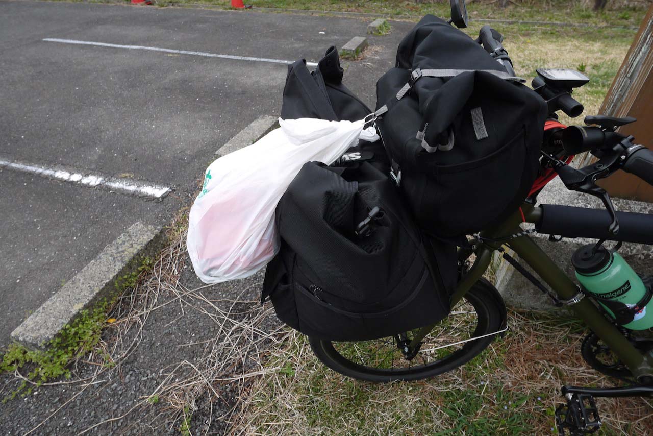 スーパーミニ記事をお届けします。皆様は、キャンプ地に到着した時のご自身の旅自転車の姿が情けないものになっていた経験はございませんでしょうか。私はよくあります。設営地の近くで食料や飲料をスーパーやコンビニで購入し、ビニール袋に入れたまま自転車にひっかけて運ぶことが多いため、愛車が次第に下のような情けない姿をしてくることがよくあるのです。