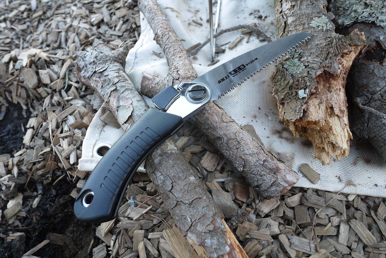 写真上・右側はスウェーデン製の安くて便利でカッコいい「モーラナイフ」の「コンパニオン」という最もスタンダードな製品で、薪割り・藪歩き・食材のカット等でマルチに活躍するのですが、ノコギリというものは「木の切断」にほぼ用途が限られる、ある意味贅沢で単機能な道具です。しかしノコギリがあると薪を自然の中から現地調達できる場合にとても助かることがあります。