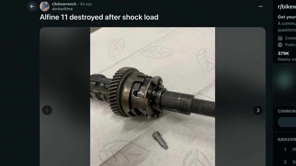 中古品だけれどもメカニックによってメンテされてきたというShimano Alfine 11スピード内装変速ハブが走行中、チェーンテンションが緩い状態で7段へと2段分シフトダウンした後に大パワーをかけたところ壊れてしまい、力が全く伝わらず空転...